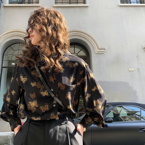 柄シャツ バタフライ柄 蝶々柄 黒 レトロ 長袖 オーバーサイズ 春服 秋服 シャツ ブラウス ダンス 衣装 ヒップホップ コスチューム 韓国ファッション 大きいサイズ 個性的 服