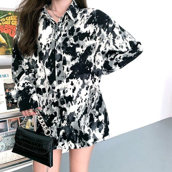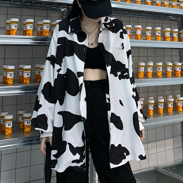 柄シャツ COW柄 オーバーサイズ 牛柄 モノトーン 長袖 ダンス 衣装 ヒップホップ コスチューム 韓国ファッション 大きいサイズ 個性的 春服 秋服 シャツ