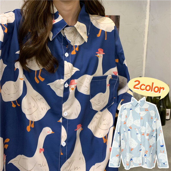 柄シャツ DUCKプリント 長袖 ビッグシルエット アヒル柄 春服 秋服 シャツ ダンス 衣装 ヒップホップ コスチューム 韓国ファッション 大きいサイズ 個性的 服