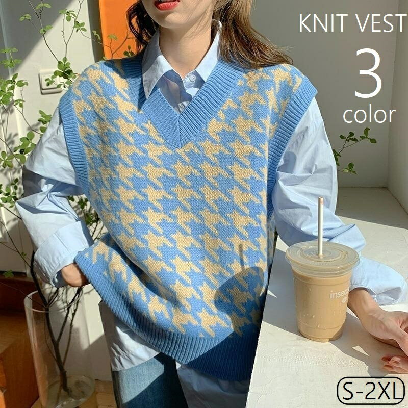送料無料 ベスト ニット ノースリーブ レディース 女性 婦人 トップス 大きいサイズ ゆったり 千鳥格子 Vネック おしゃれ かわいい リブ編み ガーリー 着回し ヘビロテ 体型カバー お出かけ 通勤 通学 黒 白 青