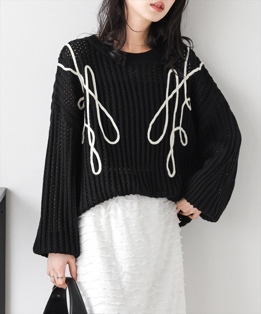 La-gemme コード刺繍 透かし編みニット ラジュール トップス ニット ベージュ ブラック グレー ホワイト【送料無料】