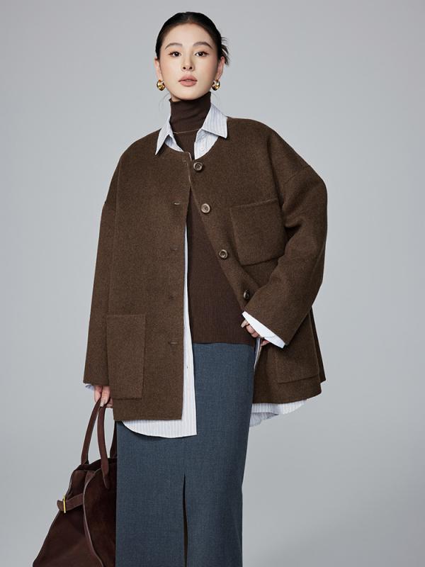 ・主素材: ウール80-90%、カシミア30%以下・生地: ダブルフェイスウール・デザイン: 両面両色・厚み: 厚手・シルエット: ゆったり型・丈: 中長(65-80cm)・襟: 丸襟・袖丈: 長袖・袖型: ストレートスリーブ・縫製: 手縫い・前閉じ: シングルブレスト・カラー: ブラウン/ライトブラウン,ダークグレー/ミディアムグレー・サイズ: S,M,L・性別: 女性・スタイル: カジュアル・ディテール: ポケット