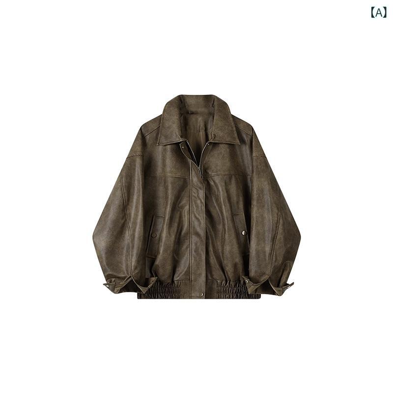 ・着丈: 普通 (50cm超65cm以内)・襟型: ラペル・デザイン要素: ポケット・素材: 合成皮革・カラー: ブラウン・サイズ: S,M,L・シルエット: ルーズ・袖丈: 長袖・袖型: ストレート・対象: 女性成人・前立て: ジッパー・スタイル: カジュアル・柄: 無地・生地: PU・主素材: PU・加工: スプライス