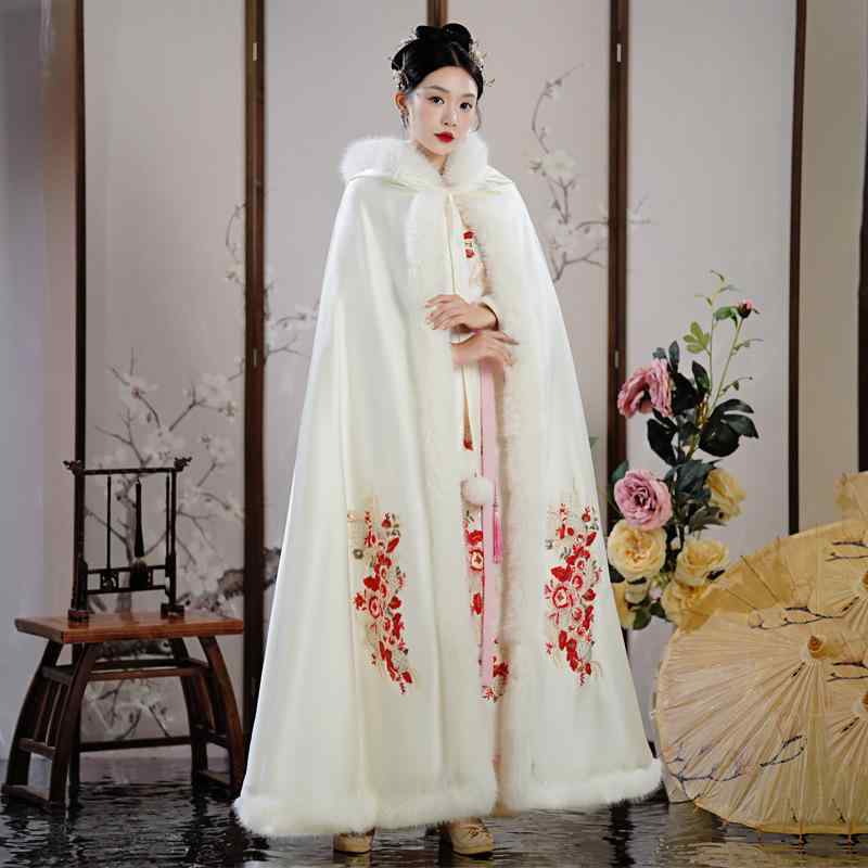 ショール レディース ホワイト 漢服 チャイナ風 オリジナルデザイン フリース裏地 厚手 肉厚 防寒 ケープ マント アウター 秋冬 撮影用 衣装 イベント コスプレ 女性用