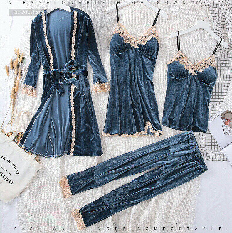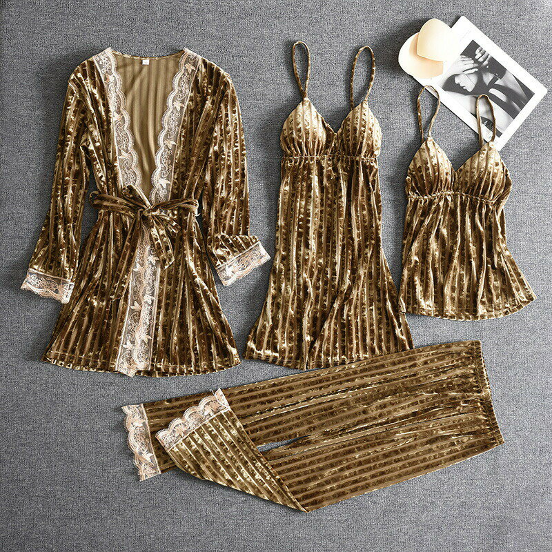 送料無料【4点セット】パジャマ 全4カラー レディース ベロアー生地 春秋 アイマスク お揃い レース 前開き ルームウェア ヘアリング 上下セットアップ パジャマ 上品 かわいい 婦人 部屋着 冬 長袖 キャミソール パンツ セックシ c-shuiyi-5911-gg