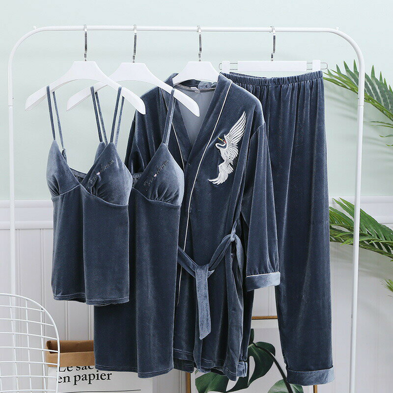 送料無料【4点セット】パジャマ 全4カラー レディース ベロアー生地 春秋 長袖 アイマスク 前開き ルームウェア ヘアリング お揃い レース 上下セットアップ パジャマ 上品 かわいい 婦人 部屋着 冬 キャミソール パンツ セックシ c-shuiyi-5915-gg