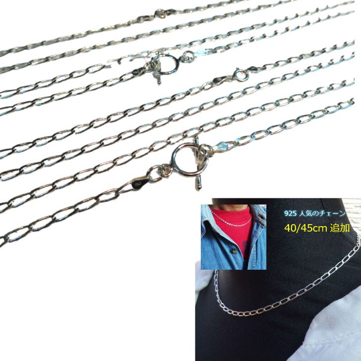 チョーカーにも40cm 45cm残り僅か!そして金具にマンテル 追加 金具選択を分かり易くしました 大人気のイタリー製のシルバーチェーン 92.5% ニッケル含まず。 16インチ約40cm。これ1本でもぐーんとオシャレ度UPの小粋なデザイン。角を落とした1つの鎖は約6×2.9mmなので40cm以下のお好きなところにヒキワを掛けてもお楽しみ頂けますよ。40cmなら2重に巻いてブレスレットにもアレンジも愉しいですよね。※着用時のたるみによる想定外のアクシデントにお気を付けください当店では一切免責とさせていただきます。 男女問わずにおすすめです。 45cm残り僅かマンテル金具もも追加しました。平均的な体型男性がつけたイメージ画像もあります。 レディースもお襟アレンジの幅が広がり、5cm長くても只今お値段据え置きも嬉しいですね。1本あたりの価格です。どちらかお選び下さいませ。 ■全長【40cm】 約41.5cm(約16インチ)【45cm】約45cm■幅 約2.9〜3mm■導入部 約2.5×3.1mm約4mm以上のペンダントトップなどのカンに適応■ヒキワ外径 約5.8mmまたはロブスター金具■素材 シルバー925ニッケル含まず■made in ITALY※参考画像のペンダントなど本品以外は付いておりません。 マンテル金具の大きさ長さ約20.9mm/丸型外径約11mmbar 約17.5mm/1mmのCカンでジョイントします。 ※マンテル金具はペンダントが入らない場合があります。これ1本でお楽しみくださいませ。 金具の選択肢からお選びくださいませ。 ▼他のシルバーチェーンも見る♪ ■14インチ(約35cm)シルバーチェーン ■15インチ(約36cm)シルバーチェーン ■16インチ(約40cm)シルバーチェーン ■18インチ(約45cm)シルバーチェーン ■20インチ(約50cm)シルバーチェーン ■22インチ(約55cm)シルバーチェーン ■24インチ(約60cm)シルバーチェーン ■28インチ(約70cm)シルバーチェーン ■30インチ(約76cm)シルバーチェーン ▼一点もの、オンリーワンの個性的なアクセサリーから▼ ⇒インポートペンダントはコチラ ▲お手頃価格(プチプライス)のものまで▲ ▼全作「一点もの」「オンリーワン」の世界!▼ ⇒工房発のペンダントはコチラ ▲直輸入した希少な天然石を使った工房アクセ▲ ※撮影条件やお客様のモニターによっては画像の色が実際のものと多少異なって見える場合がございますので あらかじめご了承下さい。 メール便 追跡あり 日本全国198円無料キャンペーン時あり 【クリックポスト】 クリックポストとは? メール便です。 配送先の住所(日本国内)の新聞受け、郵便受け等に投函・配達するサービスです。 対応可能サイズは高さが3cmまでの箱に入る商品に限ります。 <メリット> ■ポスト投函のため不在時でも受け取りが可能です。 ※ポストに入らない場合は持ち戻りとなります。 ■お荷物の追跡番号があります。 <デメリット> ■配送日・配送時間のご指定ができません。 ■ギフト包装につきましては無料版ギフト包装のみとなります。 有料ギフト箱はご選択頂けません。(高さの関係で) ■ポスト投函後の補償は出来かねます。 ■配達が遅延した場合の補償はございません。 ■内容品についての損害賠償はございません。 ギフトラッピング 無料です↓チェーン チョーカー にも 40cm/45cm追加 チョーカー メンズ レディース シルバー ネックレス 16インチ18インチ 長さ自在でイタリー製デザイン 洗練 丈夫 Silver92.5% ニッケルフリー チェーン ネックレス 40cm 45cm メンズもOK くさり 925 シンプルでおしゃれなデザイン男女問わず大好評のイタリー製 チェーンはSilver92.5%で感触も滑らかで長くご愛用頂けるとご感想も頂いております。今回は追加料金なしで留め金具もお選び頂けます〜。再再販45cmお待たせいたしました。 9