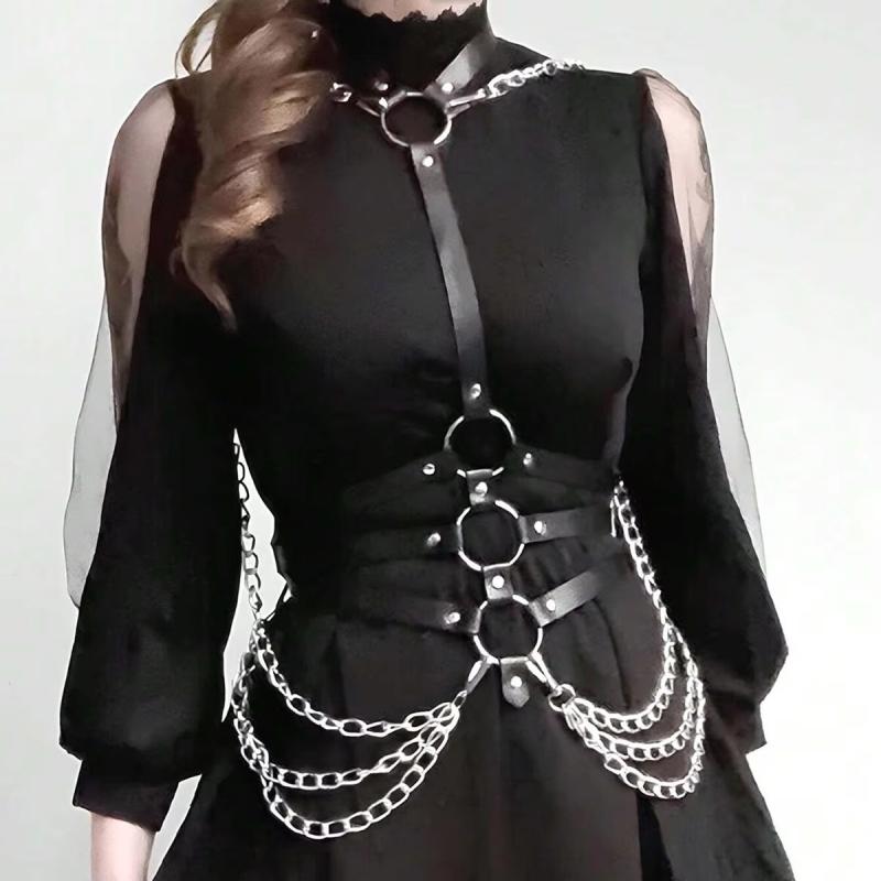 ボディハーネス レディース ボンデージ PUレザー チェーン ウエストベルト ゴシック パンク 細め 調整可能 ストリートファッション コスプレ 衣装 イベント ライブ(x2)