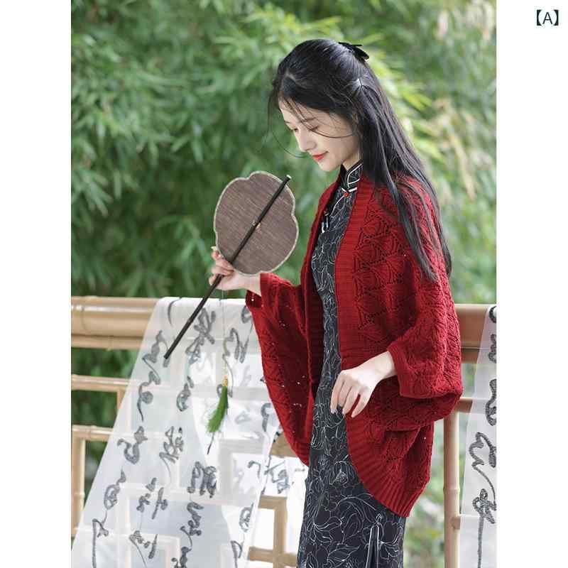 カーディガン レディース 春 秋 透かし編み かぎ編み レース 薄手 軽量 ゆったり リラックスフィット レトロ エレガント ショール 羽織り アクリル 無地 チャイナドレス 普段使い 保温 レッド ブラック アイボリー