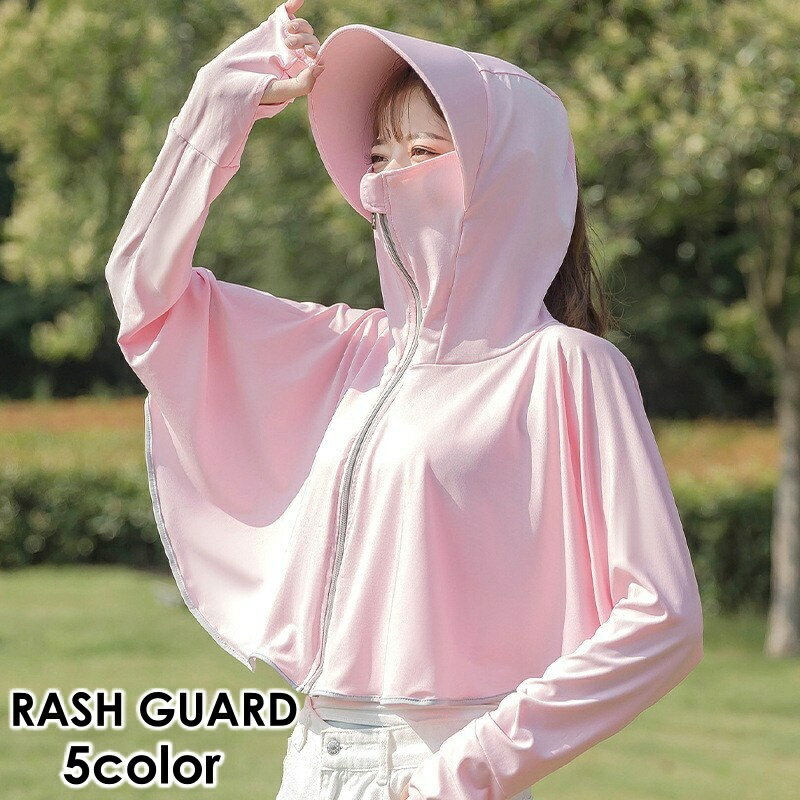 送料無料 ラッシュガード ラッシュパーカー レディース 長袖 フード付き ツバ付き フェイスガード UV対策 日焼け防止 紫外線対策 ジップアップ ショート丈 ポンチョ風 指穴付き 無地 アウター 羽織 ジャンパー 上着 アウトドア 海 プール 屋外作業 自転車 女性用