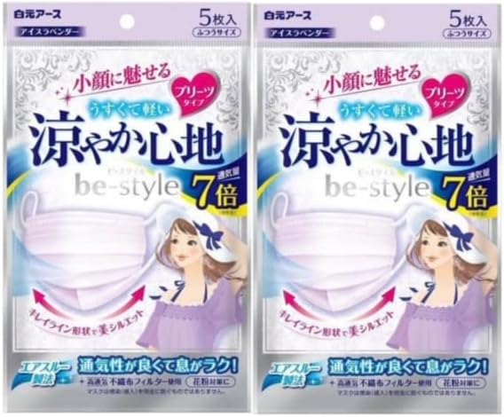 ≪スーパーSALE 限定 先着クーポン配布中≫【2袋セット】白元ア-ス ビースタイル プリーツタイプ 涼やか心地 アイスラベンダー 5枚入×2個セット (10枚)マスク 女性用