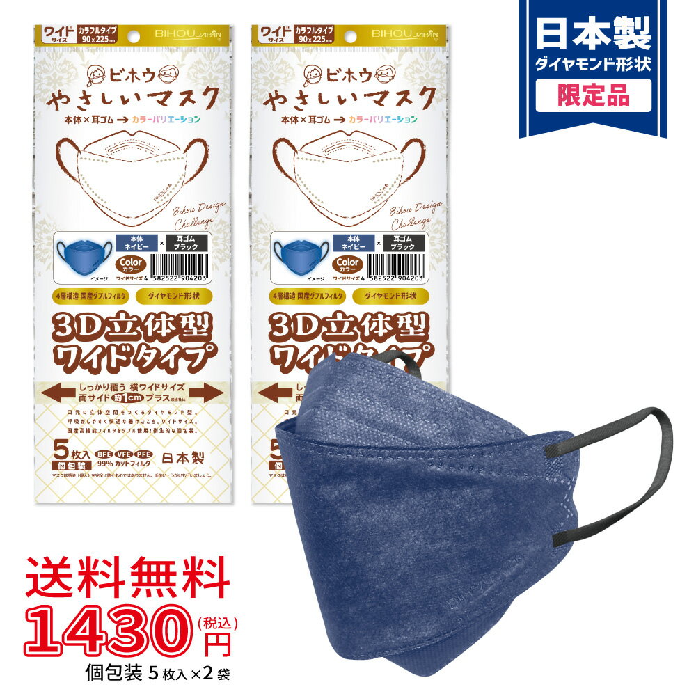 【5枚入×2袋セット】〈ワイド〉3D立体型マスク 5枚入 カラフルタイプ《ネイビー×ブラック》〈送料無料〉【美保 BIHOU 日本製 マスク工業会会員 不織布 使い捨て 男性 女性 大人用 4層 ダイヤモンド おしゃれ バイカラー 血色 ソフト生地 平ゴム K95 韓国タイプ】90×225mm