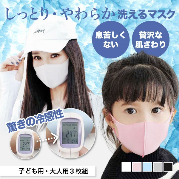 11/25限定P5倍★ 冷感 マスク 子供 子供用マスク 3枚 セット 洗える 冷感マスク 男の子 女の子 大人 女性 キッズ こども 子供用 キッズ用 子ども用 女性用 大人用 こども用 立体型 小さめ 紐 調整 無地 白 黒 グレー ピンク ブルー 血色マスク 春 夏 秋 冬 幼稚園 小学生 中
