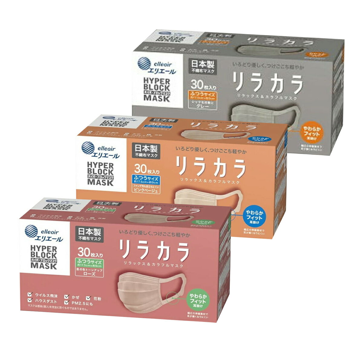 【送料込】大王製紙 エリエール ハイパーブロックマスク リラカラ 色違いセット ふつう (ローズ ・ ピンクベージュ ・ グレー) 30枚入 各1箱セット