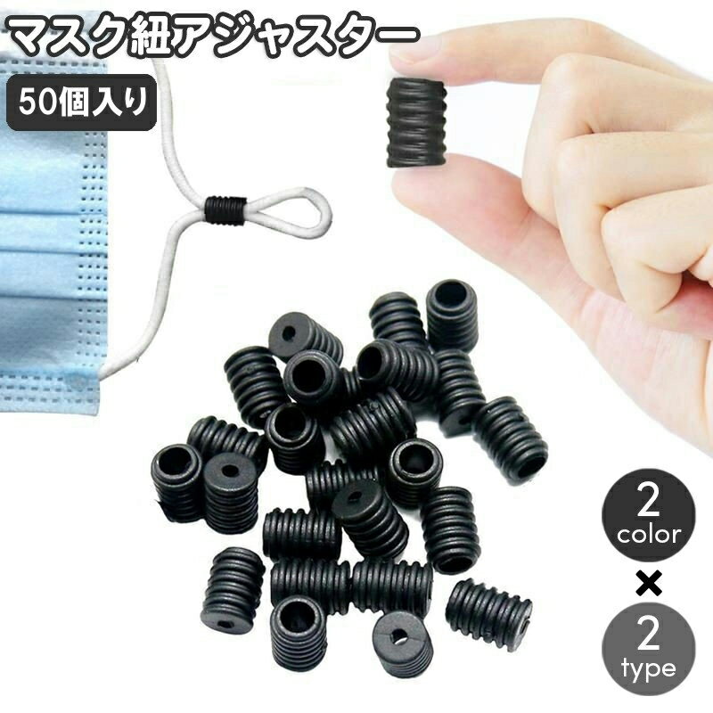 送料無料 マスクアジャスター 50個入り ストッパー 留め具 バックル マスク紐 ゴム紐 耳紐 ひも 長さ調節 調整 フィット ヒモ 丸型 円筒型 螺旋 ラウンド ブラック ホワイト