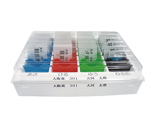 仕切板は入れ替えできますので、1日2〜4回の処方に対応できます。 ・最大28マスに区切る事ができ、1マスは分包紙サイズで便利です。 ・仕切板を外すと軟膏容器等も収納できます。 ・軽量・フタ付きで積み重ねが容易です。材質:トレー/PS(ポリスチレン)、フタ/PET(ポリエチレンテレフタレート)、仕切板/ABS樹脂 ・1マスサイズ:69.5×23.5×79mm ・サイズ(mm):322×222×85 ・セット内容:トレー×1個、フタ×1個、仕切板(青・赤・緑・黒)×各6枚、シール(用法・曜日・名前)×1枚 ・おくすり仕分薬仕切板は入れ替えできますので、1日2〜4回の処方に対応できます。 ・最大28マスに区切る事ができ、1マスは分包紙サイズで便利です。 ・仕切板を外すと軟膏容器等も収納できます。 ・軽量・フタ付きで積み重ねが容易です。材質:トレー/PS(ポリスチレン)、フタ/PET(ポリエチレンテレフタレート)、仕切板/ABS樹脂 ・1マスサイズ:69.5×23.5×79mm ・サイズ(mm):322×222×85 ・セット内容:トレー×1個、フタ×1個、仕切板(青・赤・緑・黒)×各6枚、シール(用法・曜日・名前)×1枚 ・おくすり仕分薬