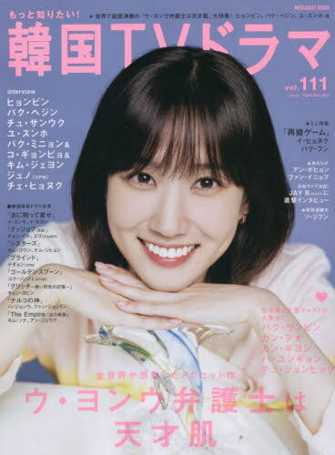 出荷目安の詳細はこちら内容詳細★韓流ドラマにはこの1冊!オリジナル・ロングインタビュー&グラビア満載!★vol.111 内容紹介●表紙:パク・ウンビンパク・ウンビンが「もっ韓」表紙に初登場!!*世界中で反響を呼んだ話題作「ウ・ヨンウ弁護士は天才肌」の主演パク・ウンビン! 彼女の魅力を詰め込んだ撮り下ろしのグラビアと本誌独占ロングインタビューをお届け★*「ウ・ヨンウ弁護士は天才肌」の撮影裏話に加え、「恋慕」や「秘密の扉」などの過去作、気になるプライベートな話もたっぷり聞きました☆*誠実な人柄が伝わってくる30問30答、綴じ込みポスターまで、丸ごとご堪能を!●ドラマ特集「ウ・ヨンウ弁護士は天才肌」*自閉スペクトラム症の弁護士が大奮闘! 世界的ヒットを飛ばした感動のヒューマンドラマを大特集*主人公を取り巻く仲間たちを演じて人気急上昇! カン・テオ、カン・ギヨンら注目俳優のインタビューを掲載*人物相関図&見どころ&事件概要を見開き2ページにまとめました☆*ユ・インシク監督&ムン・ジウォン脚本家の制作秘話対談も必見!!カン・テオ/カン・ギヨン/ハ・ユンギョン/チュ・ジョンヒョク/チョ・ヒョニョン/チョン・ベス「再婚ゲーム」*超高級結婚相談所を舞台に、ヒロインとその恋敵が愛とプライドを懸けた復讐バトルを繰り広げる話題の愛憎ドロドロ劇*女性ファンのハートをつかんだイ・ヒョヌクとパク・フンのインタビューを掲載*相関図&見どころをギュッと1ページにまとめました☆イ・ヒョヌク/パク・フン●注目インタビュー*旬の作品の出演者最新インタビュー☆ヒョンビン 『共助2:インターナショナル』パク・ヘジン 「今からショータイム」チュ・サンウク 「太宗イ・バンウォン(原題)」ユ・スンホ 「花が咲けば、月を想い」パク・ミニョン&コ・ギョンピョ&キム・ジェヨン 「月水金火木土」ジュノ(2PM)「赤い袖先」自身初ファンミーティングで来日! チェ・ヒョヌク日本ライブ開催決定! JAY B(GOT7)●Event Report*ファン・イニョプ*アン・ボヒョン ●韓国最新ドラマ「法に則って愛せ」 イ・スンギ、イ・セヨン「グッジョブ(原題)」 チョン・イル、ユリ(少女時代)「シスターズ」 キム・ゴウン、ナム・ジヒョン「ブラインド」 テギョン(2PM)、チョン・ウンジ(Apink)「ゴールデンスプーン」 ユク・ソンジェ(BTOB)「グリッチ—青い閃光の記憶—」 チョン・ヨビン「ナルコの神」 ハ・ジョンウ、ファン・ジョンミン「The Empire:法の帝国」 キム・ソナ、アン・ジェウク●連載[第11回] 新人俳優ソ・ジフン[第9回OST見聞録] 古家正亨