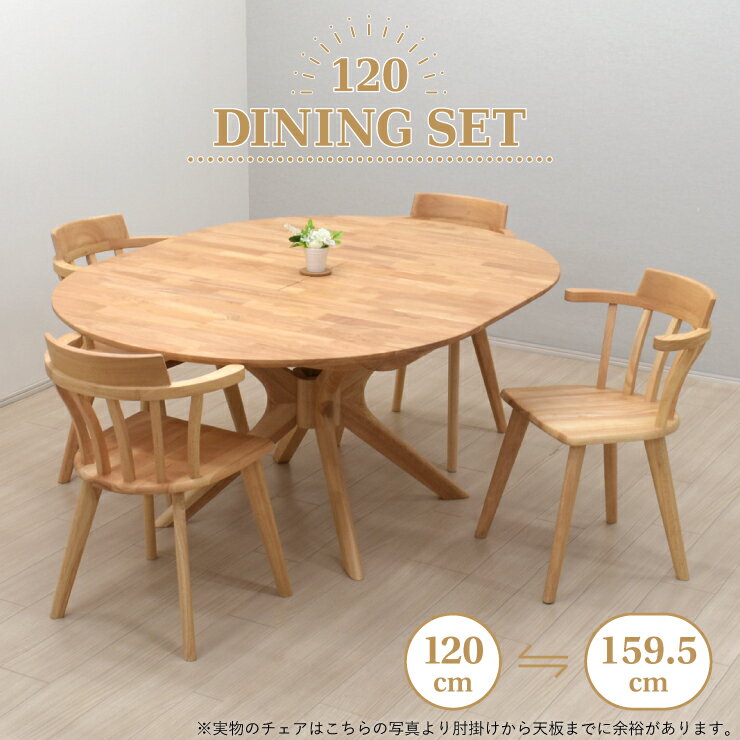 ※こちらの商品は原則キャンセルはお受けできません。 よくご検討の上、ご注文ください。 仕 様 サイズ材質 【輸入品】 ダイニングテーブル【要組立品】 幅1595/1200mm×奥行1200mm×高さ720mm 材質:ラバーウッド無垢 ダイニングチェア【要組立品】 幅525mm×奥行き495mm×高さ745mm(座面高420mm) 材質:ラバーウッド ※CN色は元々の木の素材の濃淡や節部がございます。 お届け商品によって個体差がありますのでご注意ください。 特徴 アウトレット価格でご提供させていただいております。 海外製造の木工製品のため細かな擦りキズ・汚れ等がある場合がございます。 あらかじめご了承お願いいたします。 送料 送料無料 東北・北海道・沖縄・離島は別途送料がかかります。 ※お届け先によっては配送できない場合がございます。 注意事項 【大型商品の配送について】※必ずご確認ください ・事前に配達担当営業所よりお客様へお届け日時に関する確認のご連絡がございます。 必ず配送日時のご確認をお願いいたします。 ・配送にお伺いし不在等でお受け取りいただけなかった場合、再配達料金をお客様にご負担いただく場合がございます。 ・時間指定はお受けできません。 ・配送会社・配送地域によっては、配達時間は17時までとなる場合がございます。 お届け先によっては土日祝の配達日指定不可もしくは配達曜日が限定される場合がございます。 ・商品は基本的には玄関渡しとなります。 ・商品のお届けの際にはドライバーが「1人」でお伺いいたします。 大型配送について詳細はこちら ※モニター環境により商品の色の見え方に若干の誤差が生じる場合もございます。 ※こちらは一般家庭向けの商品です。業務使用を前提とした構造にはなっておりません。。☆ 関連ページ ☆ ☆ おすすめ商品 ☆ 120cm伸長式 ダイニングチェア 選べる高さ 伸長式120-5点セット 伸長式105-5点セット 伸長式105-5点セット