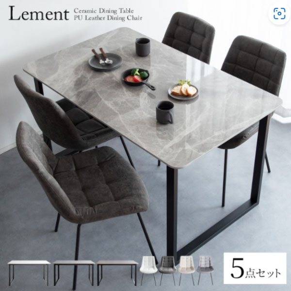 セラミック素材の大理石風天板のダイニングテーブルと、身体にフィットする形状でキルティングが施されたPUレザーのダイニングチェアのダイニングセット『Lement(レメント)』。 耐熱性や耐摩耗性に優れたセラミックは熱いお鍋やフライパンを直接置いたり、まな板なしで直接包丁でのカットができます。 お好みで選べるカラーはテーブルが鏡面仕上げのホワイトとグレー、マットなダークグレーの3カラー、チェアはPUレザータイプがホワイトとダークグレー、ベルベットがアイボリーとライトグレーの計4カラーをご用意。テーブルとチェア4脚の5点セット、テーブル単体、チェア2脚の販売がございます。 商品名ダイニングテーブル Lement(レメント) サイズ幅130×奥行き80×高さ72cm 材質天板:セラミック、フレーム:スチール(粉体塗装) 備考組立式(約15分) ※セラミック天板は約26kgあるため、組み立ては2名以上で行い怪我の無いよう十分にお気を付けください。 商品名ダイニングチェア Lement(レメント) サイズ幅51×奥行き57×高さ79cm(座面高:46cm) 材質張地:合成皮革(PU)、ウレタン、スチール 備考組立式(約10分)、2脚セット商品名ダイニングテーブル Lement(レメント) サイズ幅130×奥行き80×高さ72cm 材質天板:セラミック、フレーム:スチール(粉体塗装) 備考組立式(約15分) ※セラミック天板は約26kgあるため、組み立ては2名以上で行い怪我の無いよう十分にお気を付けください。 商品名ダイニングチェア Lement(レメント) サイズ幅51×奥行き57×高さ79cm(座面高:46cm) 材質張地:合成皮革(PU)またはポリエステル、ウレタン、スチール 備考組立式(約10分)、2脚セット ダイニングセット Lement 5点セット販売 テーブル単体販売 チェア2脚セット販売