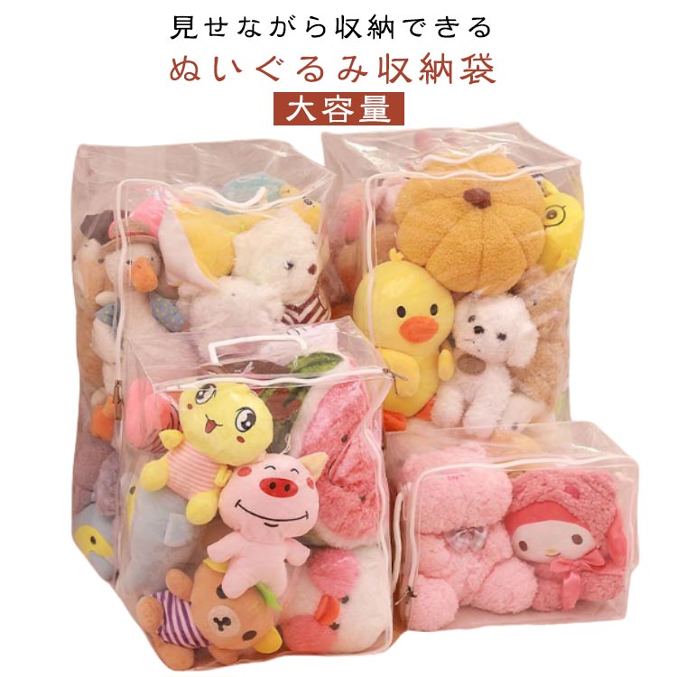まとめ収納可能?見せながら収納できるぬいぐるみ収納袋。防塵・防水素材で、お気に入りのぬいぐるみがいつも綺麗なまま保管できます。クリアなので、中身が見えるから確認が簡単にできます。玩具やぬいぐるみはもちろん、バッグ、ストール、マフラー、衣類、布団など様々な物を収納できる多機能収納ケースです。 サイズ S M L XL サイズについての説明 S 30*23*15cm M 30*41*20cmL 30*61*25cm XL 46*61*38cm ※サイズ表の実寸法は商品によって1-3cm程度の誤差がある場合がございます。 素材 PEVA 色 透明 備考 ●サイズ詳細等の測り方はスタッフ間で統一、徹底はしておりますが、実寸は商品によって若干の誤差(1cm・3cm )がある場合がございますので、予めご了承ください。 ●製造ロットにより、細部形状の違いや、同色でも色味に多少の誤差が生じます。 ●パッケージは改良のため予告なく仕様を変更する場合があります。 ▼商品の色は、撮影時の光や、お客様のモニターの色具合などにより、実際の商品と異なる場合がございます。あらかじめ、ご了承ください。 ▼生地の特性上、やや匂いが強く感じられるものもございます。数日のご使用や陰干しなどで気になる匂いはほとんど感じられなくなります。 ▼同じ商品でも生産時期により形やサイズ、カラーに多少の誤差が生じる場合もございます。 ▼他店舗でも在庫を共有して販売をしている為、受注後欠品となる場合もございます。予め、ご了承お願い申し上げます。 ▼出荷前に全て検品を行っておりますが、万が一商品に不具合があった場合は、お問い合わせフォームまたはメールよりご連絡頂けます様お願い申し上げます。速やかに対応致しますのでご安心ください。