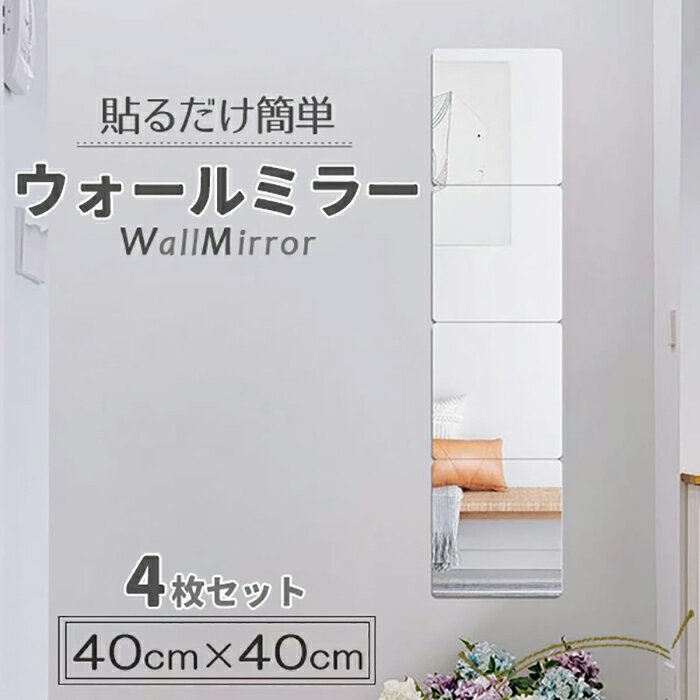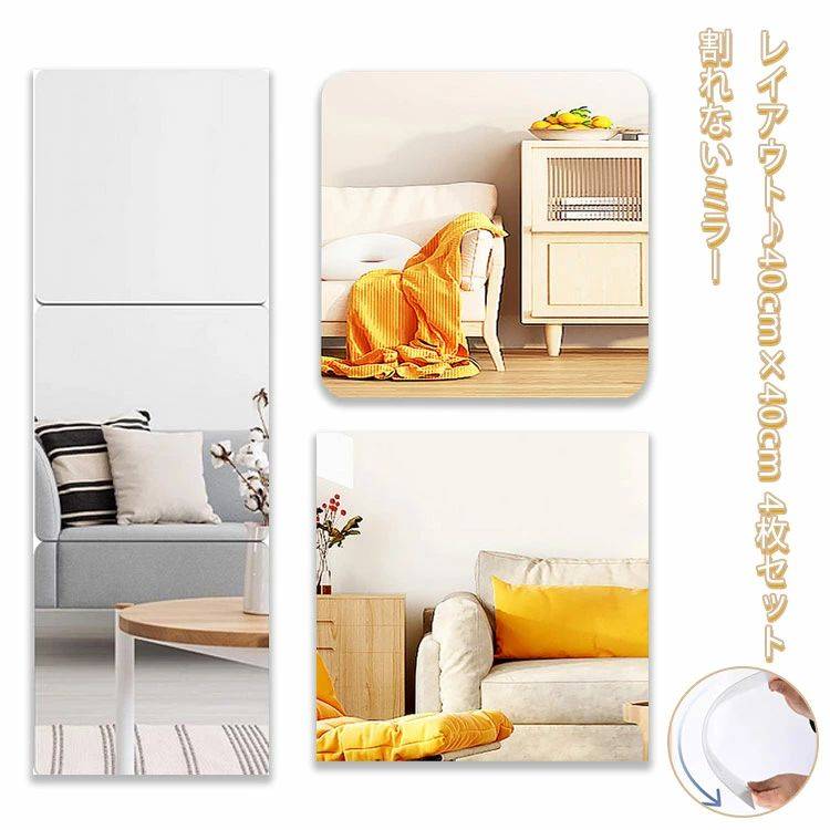 アクリルミラー 40×40cm 4枚セット 貼るミラー 安全ミラー 割れないミラー 鏡 貼る鏡 全身鏡 壁掛け ミラー ミラーシート ミラーシール 飛散防止 ケガ防止 穴あけ不要 ステッカーミラー 四角形 クローゼット 寝室 トイレ バスルーム