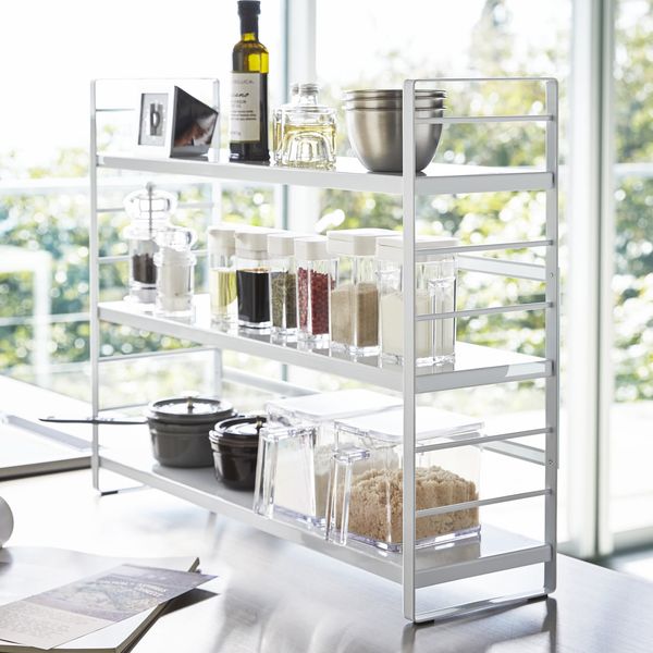 シンク上のデッドスペースを便利な収納にコンロ奥や横の隙間など、シンク上のデッドスペースを活用できるキッチンシェルフ。調理小物を一括収納一番下の空間も含めれば棚は3段。 調理道具などをかけられるフック5個付き。使いたいときにサッと取り出せるカトラリーポケットも付いています。調味料、スパイス類、キッチン道具、小物をこれ一つで一括収納!小鍋鍋のちょい置きにも。棚の高さが変えられる棚の高さは5cm間隔で変えられます。組立式サイズ(約)幅58×奥行16×高さ45.5cm材質本体/スチール(粉体塗装) カトラリーポケット/ABS樹脂 付属品/フック×5耐荷重(約)各棚/5kg フック1つあたり/500g製造国中国メーカー山崎実業商品バリエーション関連キーワード: 山実 yamazaki シンク周り 調味料 スパイス シーズニング オイル 小物 調理器具 調理道具 収納 棚 ラック スタンド ケース 3段 キッチン 台所 ガス台 IH 横 サイド フック付き サイドポケット カトラリー キッチンツール デッドスペース 有効活用 ちょい置き 組み立て式 幅58 奥行16 高さ46 センチ cm 以内 スチール製 耐荷重5kg キッチン用品 キッチングッズ 台所用品 台居所グッズ シンプル すっきり 片付く コンパクト 省スペース 便利 おすすめ 白 4903208032575