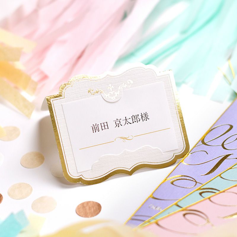 結婚式席札DIY手作りキット「クレール」 ◆テーブルを華やかにしてくれる高級感!どんなカラーとも好相性のホワイト×ゴールド席札 高級感を醸し出すゴールドの箔押しが上品な輝きをはなちます。さまざまなカラーコーディネートのなかに美しく馴染むのに、おしゃれなフォルムがテーブルコーデを格上げしてくれる万能席札です。 台紙は上質感のある特殊紙で、コシのあるやわらかさと布目のような表情を持ち、触れればさらりと手に馴染む美しい質感です。 ◆後姿もぬかりなく!際立つ存在感のクレール席札 ゲストテーブルに置く席札は向かいの席のゲストから見えるから後姿にだって気を抜けません!背面デザインにまでこだわったどこから見てもおしゃれな席札です。 ◆テンプレート付きで使いやすい!手作りDIY席札 ご購入特典のテンプレートでA4サイズの専用用紙に10名分の席札を印刷。用紙にはミシン目入りで、手でも簡単に切り離せます。台紙の切り込みにセットすれば完成!簡単なのにプロの仕上がりを実現します。忙しい結婚準備が助かるDIYキットです。 ◆おすすめ!手書きのメッセージでおもてなし度もカンペキ 席札の内側に手書きでメッセージを書いてみては?ゲストへの心づかいが喜ばれます。(→画像参考:ラメ感が美しく書きやすいゲルインクのペンはこちら) お届けの内容 (1)台紙(10枚) (2)A4ミシン目プリント用紙(1枚) ※1セットで10名様分作れます ※商品画像イメージはテンプレートを印刷したものでお届けするのは無地のペーパーです ご購入特典 商品お届け時に、ファルベのテンプレートサイトのダウンロードパスワードを同梱いたします。ご購入特典として サイト内の全てのテンプレートをご利用いただけます。 ※ テンプレートはMicrosoft Wordで編集可能です。 関連商品 プリント用紙の追加はコチラ【席札名前印刷用A4シート追加】 クレール招待状手作りセット クレール席次表手作りセット