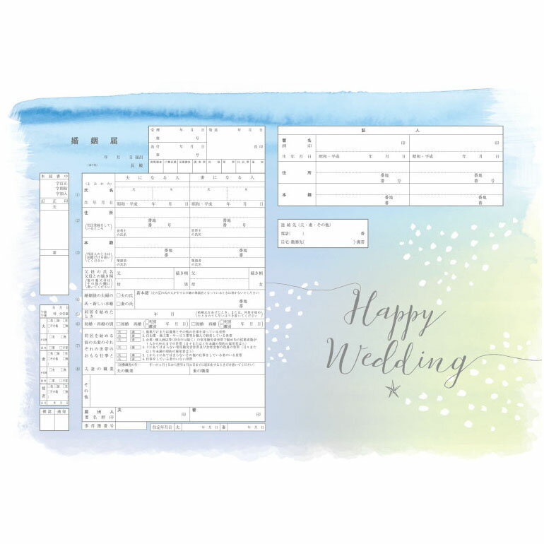 柔らかなグラデーションに、ワンポイントの星が輝く可愛いらしいデザイン。 <セット内容> 1)役所提出用婚姻届(サイズA3)・・・2部 2)記念用婚姻届(サイズA4)・・・1部 3)飾れるクリアスタンド(A4用)・・・1セット 4)婚姻届提出マニュアル・・・1部 ※婚姻届製作所のデザイン婚姻届は、法務省から許諾を頂いた当社のガイドラインをもとに制作しています。 日本全国の役所でご提出いただけます。 ※婚姻届製作所の婚姻届には元号(平成・令和など)をご自身でご記入いただく箇所がございます。詳しくは同封の婚姻届の書き方をご確認ください。柔らかなグラデーションに、ワンポイントの星が輝く可愛いらしいデザイン。