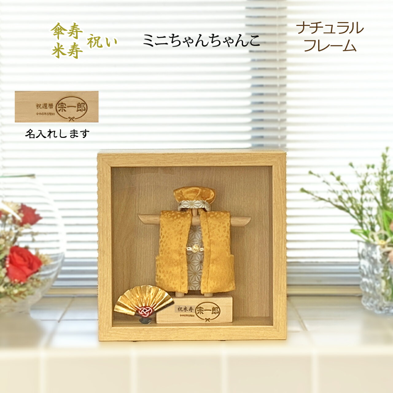 ミニちゃんちゃんこと頭巾<本格派> フレーム入り 金茶 傘寿 米寿 名入れ無料 長寿祝い 賀寿祝い 退職祝い ギフト プレゼントに 母の日 父の日 敬老の日 記念品 祝着 ちゃんちゃんこ 飾り 小サイズ