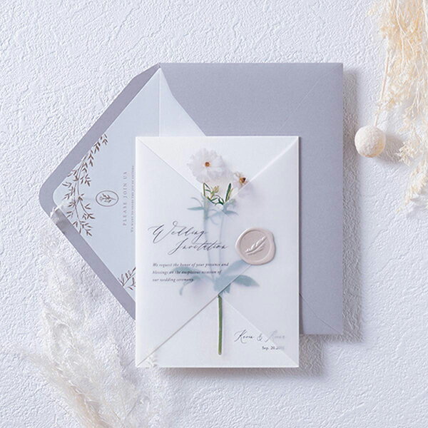 10名様単位での販売となります。 価格は10名様分となります封筒・返信ハガキ・付箋など、上記価格にすべて含まれています ※クリックすると別ウィンドウで表示されます。 様々なペーパーアイテムをご用意しています。 【豊富なラインナップ】招待状 席次表 座席表 席順表 席札 名前札 タグ ネームカード 手作りキット 飾り紙 イニシャルスタンプ 【こんなシーンで】ウェディング ブライダル ペーパーアイテム 結婚式 披露宴 二次会 1.5次会 会費婚 パーティー 謝恩会 クラス会 同窓会 ゴルフコンペ イベント 【人気のワード】高級感 おしゃれ カジュアル 無料テンプレート オリジナルCharme de fleur -シャルムドフルール-(ニゲラ) 招待状【10名様分】商品番号:pa1151 シャルムドフルール(ニゲラ) ナチュラル婚の方もエレガント婚の方も、お気に入りの花でコーディネート。一輪の花をトレーシングペーパーで包み込むことで、花の贈り物のよう。ゲストへの感謝や愛情を一緒に込めて… シリーズ一覧はこちら 》 商品特長 シーリング風のシールで留めることで海外ウェディングをイメージさせるトレンド感ある招待状に。 トレーシングペーパーの帯で中紙を包む形となります。 中紙に印刷した一輪の透け感がおしゃれ。 挙式日と新郎新婦さまのお名前が入れられます。 裏面にブランドロゴが入ります 内容物表紙+中紙+封筒+付箋+返信ハガキ+シール等のセット商品になります ■内容物(※10名様単位での販売となります。) 招待状 表紙 148×257mm 10枚 招待状 中紙 148×210mm 10枚 (A5 ZRアイボリー・二つ折筋入り) 封筒 レギュラー(白色) 176×120mm 10枚 封筒用飾り紙 10枚 返信ハガキ 148×100mm 10枚 付箋 91×55mm 10枚 シール invitation 10枚 シーリング風シール ホワイト10枚(1枚 直径約25mm) テンプレートダウンロードパスポート★ ※無地でのお届けとなります。 ※製品改良の為、仕様の一部を予告なく変更することがございます。あらかじめご了承ください。 ※印刷イメージです ≫予備・追加アイテムのご購入はこちら テンプレートについて 表 裏 ※文章はお客様で作成いただくこともできます。 セット方法について こちらのアイテムはセット作業が必要です。リボンやチャームがついているアイテムなど、お客様ご自身でのセットが必要になります。 テンプレート ■完成までの流れ 手差しプリンターが必要です 用紙が大きく曲がって排紙されるタイプですと、紙詰まりの恐れがありますので、ストレート排紙対応の手差しプリンターで印刷をしてください。 このシリーズのテンプレートをすべて見る≫ 無料でダウンロードできる!お試しテンプレートはこちら≫ 手作りキットのよくある質問はこちら≫ ご注意 お客様のモニタ環境によって画像の色が実物と異なって見える場合がございます。あらかじめご了承ください。 お得に買うならセット購入がオススメ! シリーズ商品 Charme de fleur -シャルムドフルール-(ニゲラ) 招待状 1,980円 Charme de fleur -シャルムドフルール-(ニゲラ) 席次表 1,710円 Charme de fleur -シャルムドフルール-(ニゲラ) 席札 211円