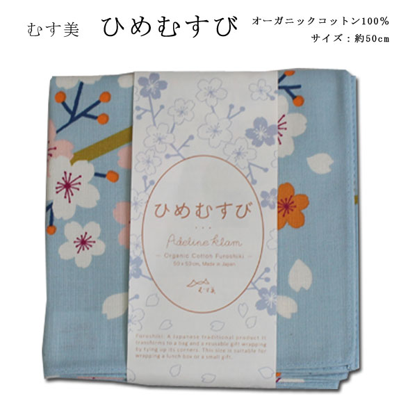 [▲定番▲] 【モダン柄】むす美「ひめむすび Adeline Klam」チーフ風呂敷(日本製)50cm×50cm/綿100%/桜・ブルーグレー≪お取寄せOK≫【メール便OK】key-08