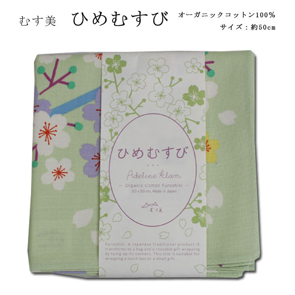 [▲定番▲] 【モダン柄】むす美「ひめむすび Adeline Klam」チーフ風呂敷(日本製)50cm×50cm/綿100%/桜・グリーン≪お取寄せOK≫【メール便OK】key-08