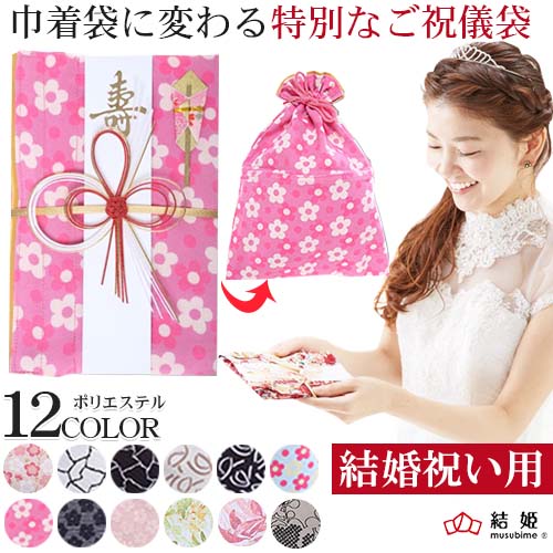 【白桃福梅、モダン花の2色追加★】 巾着袋として使い続けることができる、ご祝儀袋。 いつもと違う、いつもよりも特別な想いを伝えたいとき。 そんな時に、思い出してもらえる、特別な祝儀袋です。 主賓、乾杯の挨拶など特別な結婚式に、形に残るお祝いの心を贈りたい結婚式におすすめです。 【贈って嬉しい】 ひとつひとつ丁寧に手作業で作られており、ひとつとして同じものはありません。 しっかりとあなたの特別な想いを包み結びます。 【贈られて嬉しい】 丹精込めて作られた結姫は、数あるご祝儀袋の中で際立ち、特別な想いがきっと伝わり、贈られたあの人を笑顔にするでしょう。 【縁が結ばれ続けて嬉しい】 巾着袋として包むもの自体も贈り物とし、贈られたあの人のそばにあり続け、あなたの特別な想いが結ばれ、末永くご愛用いただけます。 ●ブランド:結姫(むすびめ) ●生産国:日本製 ●商品サイズ 祝儀袋時:縦約19cm×横約12cm 巾着袋時:縦約24cm×横約19cm ●重量:約50g ●生地:ポリエステル100% ハリ・コシのある丈夫なポリエステル素材使用で、シワになりにくく綺麗な状態で長くお使いいただけます。 ●セット内容 ご祝儀袋(本体)×1、短冊(壽)×1、短冊(無地)×2、のし×1、中包み×1 ●ご用途:結婚祝い、入籍祝い、婚約祝いなど 【結婚祝い用の一覧はこちら→】 【一般御祝用の一覧はこちら→】 ※掲載写真の色合いはお使いの環境(マシン・モニター・OS)により実物と多少異なる場合がございます。予めご了承ください。 ※商品は手作りの為、商品により色柄・形等が多少異なる場合がございます。予めご了承ください。 ※和紙(短冊)の性質上、シミのような点が付いている場合がございますが、そちらは汚れではございませんので予めご了承下さいませ。 【配送方法について】こちらの商品はメール便発送に限り送料無料となります。メール便をご利用の際は必ず【メール便ご利用のご注意】をご確認下さいませ。※メール便サイズに収める為、パッケージ箱を崩しての発送になる場合がございます。予めご了承下さいませ。※同梱の商品が送料別の場合はそちらの送料をご請求させて頂きます。予めご了承下さい。※お支払い方法が代引決済をご希望されるお客様は宅配便(宅配送料ご負担)での発送となります。予めご了承下さいませ。 【巾着袋に変わるご祝儀袋の一覧はこちら→】 【ペンケースに変わるご祝儀袋の一覧はこちら→】 【結姫(むすびめ)ご祝儀袋の一覧はこちら→】 【関連キーワード】 巾着袋 巾着 巾着タイプ 巾着に変わる 巾着袋に変わる 巾着に変化 巾着袋として使える 記念 記念品 メモリアル 結婚祝い用 ご結婚御祝い ご結婚 結婚のお祝い 祝儀袋 ご祝儀袋 お祝い 御祝い 贈り物 特別 特別なご祝儀袋 特別な祝儀袋 特別な方 友人 親友 親しい友人 同僚 同期 クラスメイト 上司 後輩 親戚 身内 兄弟 姉妹 従兄弟 従姉妹 仲の良い方 福井県 福井 福井県産 日本製 made in JAPAN 国産 水引き 梅結び 短冊熨斗 熨斗 短冊付き 中包み付き 金封 金銭を贈る袋 再利用 エコ SDGs エスディージーズ キリン(白) キリン(紺) リボン(白) リボン(紺) 小花2(水色) 小花2(ピンク) 花畑(紺) 花畑(ピンク) 花壇(緑) 花壇(ピンク) 白梅福梅 モダン花