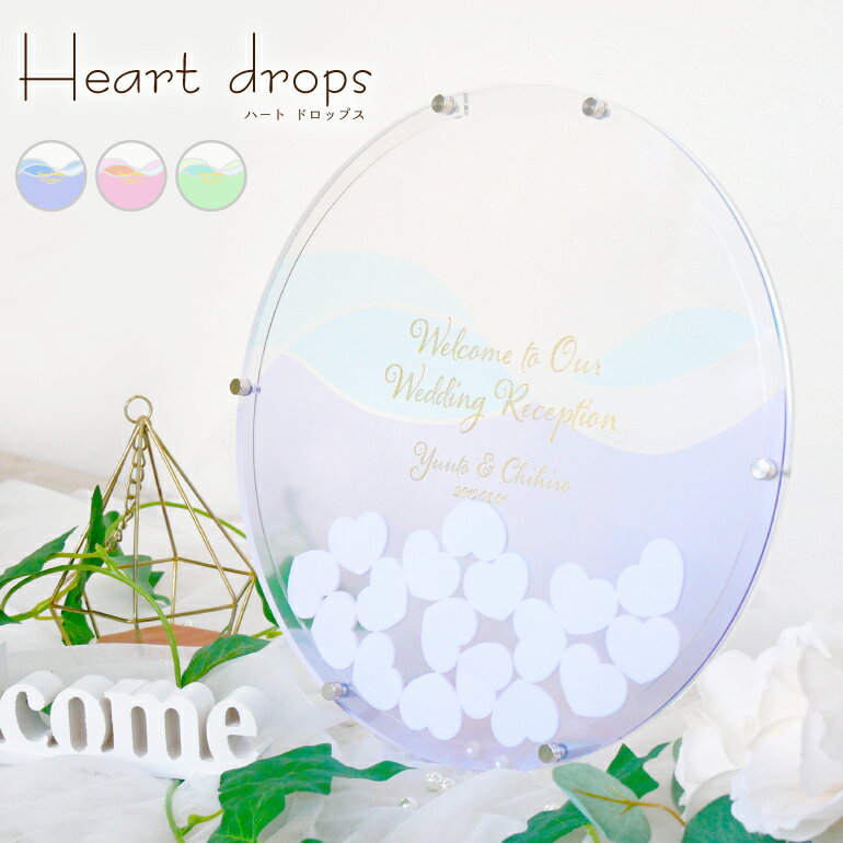ウェディングドロップスはゲストからのメッセージが綴られたチップを参加者みんなで完成させるウェルカムボードです。 挙式後はお部屋のインテリアとしてお使いいただけます。 ほんのり色のついたフレームに白のハートチップをドロップするとチップの色が変わって見える当店オリジナルデザインです。 メッセージ・新郎新婦様のお名前・日付を高級感のある箔押し印刷で刻印いたします。 【名入れ情報】 ※原則、ご記入通りに製作いたしますので記入漏れ・誤字などにご注意ください。 【クレジットカードの分割払いついて】 クレジットカードでのお支払いは「一括払いのみ」ご利用可能となっております。分割払い・リボルビング払いはご利用いただけません。 ご選択いただいた場合はお支払方法変更のご案内させていただきます。予めご了承ください。 ウェルカム ボード スペース ハート ドロップス 結婚証明書 ゲスト 参加型 芳名帳 卓上 飾り 二次会 ガーデン 祝い 祝福 メッセージ 言葉 寄せ書き 名入れ おしゃれ かわいい きれい 贈り物 誕生 記念 ウェディングツリー