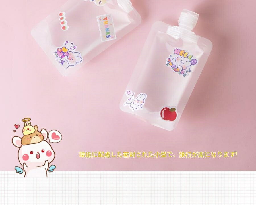 かさばらずに持ち運べて旅行にぴったり♪ シャンプーや化粧水を小分けできる、便利なトラベル用パウチ容器です。 耐熱:-20〜60℃ 【サイズについて】 画像をご参照ください。 【カラーについて】 生産ロットにより柄の出方や色の濃淡が異なる場合がございます。 お使いのモニターや撮影時の光の加減などにより 画像と実際の商品のカラーが異なる場合もございます。 予告なしにカラーやデザインなどの変更がある場合もございます。 【素材について】 PET、ナイロン、PE