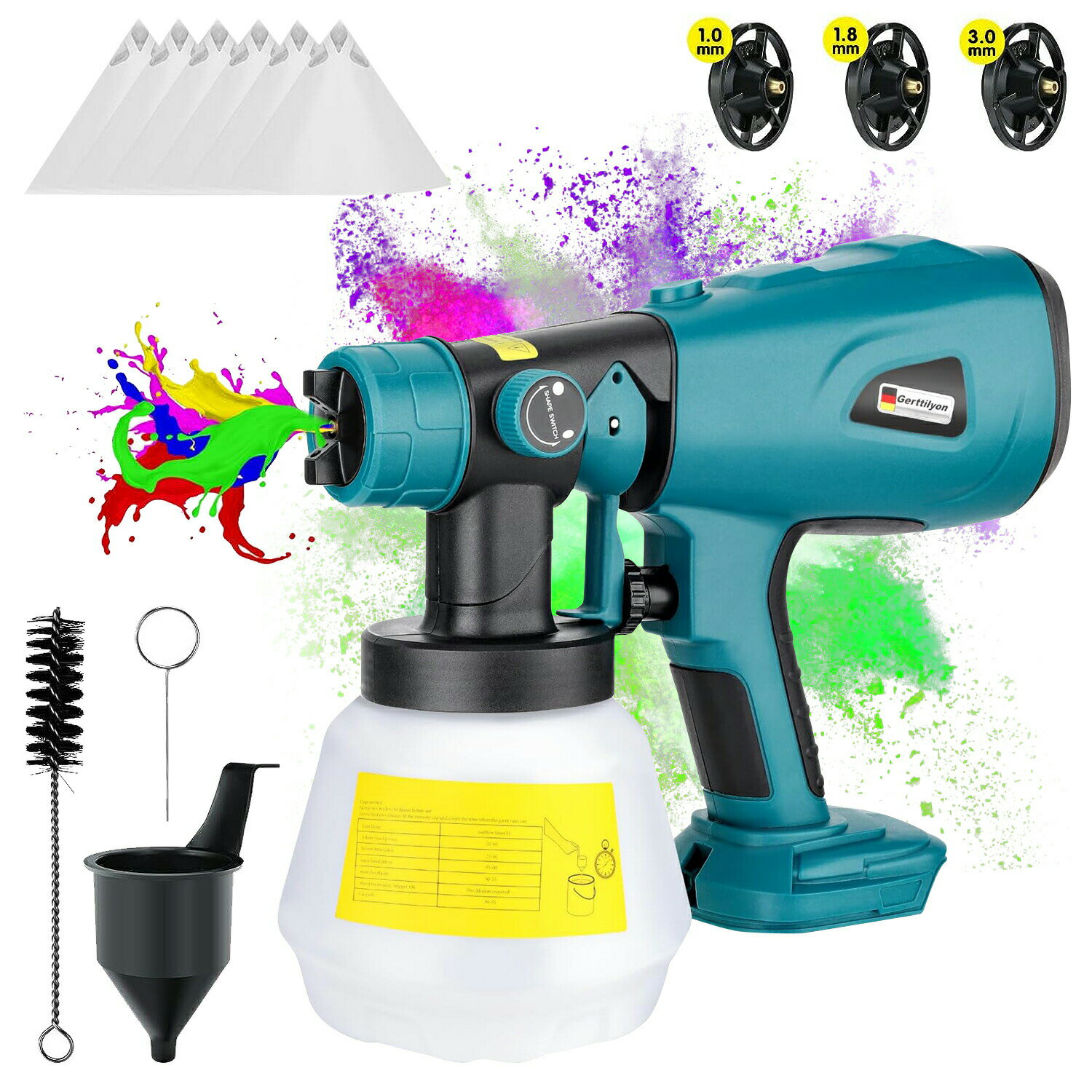 商品情報 【電動・コードレス】 21V 1.5Ahの大容量バッテリーを使用し、2Hを充電するだけで、約25-35分間使用し続けることができます。 電源の確保やコンプレッサーの準備が不要で、配線の制約がなくなり、屋内外での使用に便利です。 電池式のスプレー塗料は、有線のスプレー塗料よりも強力なスプレー力があり、スプレーの効率が高く、塗料の安定性が高くなります。 また、ブラシやローラーでの塗装よりも時間と労力を節約できます。 人工力学的な設計で、持ち心地が良く、長時間使用しても疲れない。 DIYや塗装フェンス、内壁、手工芸品、橋、家電製品、木製家具、テーブル、椅子、キャビネット、手工芸品などに非常に適しています。 マキタ18Vバッテリー対応可能例えばBL1830 BL1840 BL1850 BL1860 BL1860B BL1830B BL1850B BL1860B BL1890Bなど適用しています。 【6種類のノズル・調整可能な流量】 6種類の口径のノズル(1.2mm、1.5mm、1.8mm、2.0mm、2.5mm、3.0mm)を搭載し、すばやく交換し、さまざまな濃度の塗料を吹き付けられる。 吹き付け項目ごとに最適なノズルを選ぶことができ、手間がかからない。 作業の必要に応じて、左右のつまみを回転させることで吹き付け流量の大きさを調整することができます。 大きく塗りたい場合は、右に回転させてください。小さく塗りたい場合は左に回してください。 (注: 使用後は毎回ノズルをきれいにすることを忘れないでください) 【軽量設計、高性能】 GETRI弊社のコードレススプレーガンは、パッケージを含めてわずか1.3KGの軽量設計を採用しており、使いやすいです。 バッテリー式塗料スプレーは、電源コード式よりも強いスプレー力があって、700w強さパワーが付き、 回転スピードは42000RPM、作業際に水量は最大650ml/minを達つ、より速い作業効率を提供します。 【水性・油性塗料両対応】 スプレーガン本体は水性・油性両方の塗料に対応しています。 1000mlのタンクを装備し、詰め替え後も長時間使用でき、半透明のデザインなので、作業時に水がどれだけ残っているかがわかるのでとても便利です!メーカー希望小売価格はメーカーカタログに基づいて掲載しています