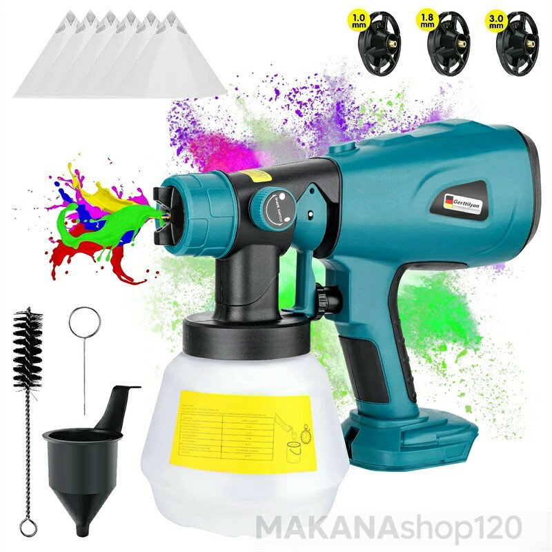 メーカー希望小売価格はメーカーサイトに基づいて掲載しています メーカー希望小売価格はメーカーサイトに基づいて掲載しています メーカー希望小売価格はメーカーサイトに基づいて掲載しています【2025新登場強化版】コードレススプレーガン 充電式 電動スプレーガン マキタ18Vバッテリー対応 バッテリー2枚付属 電動スプレー 3つの噴霧方法 6つの銅ノズル 噴霧の幅調整可能【水平 垂直 円弧噴霧】1000mlタンク付 小型軽量 家庭用塗装ガン コードレススプレーガン 電動スプレーガン 充電式 ペイントスプレー 電動塗装機 家庭用塗装ガン マキタ18Vバッテリー対応 3つの噴霧方法 【水平 垂直 丸型噴霧】噴射量調節可能 【電動・コードレス】 21V 1.5Ahの大容量バッテリーを使用し、2Hを充電するだけで、約25-35分間使用し続けることができます。電源の確保やコンプレッサーの準備が不要で、配線の制約がなくなり、屋内外での使用に便利です。電池式のスプレー塗料は、有線のスプレー塗料よりも強力なスプレー力があり、スプレーの効率が高く、塗料の安定性が高くなります。また、ブラシやローラーでの塗装よりも時間と労力を節約できます。 人工力学的な設計で、持ち心地が良く、長時間使用しても疲れない。 DIYや塗装フェンス、内壁、手工芸品、橋、家電製品、木製家具、テーブル、椅子、キャビネット、手工芸品などに非常に適しています。マキタ18Vバッテリー対応可能例えばBL1830 BL1840 BL1850 BL1860 BL1860B BL1830B BL1850B BL1860B BL1890Bなど適用しています。【6種類のノズル・調整可能な流量】 6種類の口径のノズル(1.2mm、1.5mm、1.8mm、2.0mm、2.5mm、3.0mm)を搭載し、すばやく交換し、さまざまな濃度の塗料を吹き付けられる。吹き付け項目ごとに最適なノズルを選ぶことができ、手間がかからない。作業の必要に応じて、左右のつまみを回転させることで吹き付け流量の大きさを調整することができます。大きく塗りたい場合は、右に回転させてください。小さく塗りたい場合は左に回してください。(注: 使用後は毎回ノズルをきれいにすることを忘れないでください)【軽量設計、高性能】 GETRI弊社のコードレススプレーガンは、パッケージを含めてわずか1.3KGの軽量設計を採用しており、使いやすいです。バッテリー式塗料スプレーは、電源コード式よりも強いスプレー力があって、700w強さパワーが付き、 回転スピードは42000RPM、作業際に水量は最大650ml/minを達つ、より速い作業効率を提供します。【水性・油性塗料両対応】 スプレーガン本体は水性・油性両方の塗料に対応しています。1000mlのタンクを装備し、詰め替え後も長時間使用でき、半透明のデザインなので、作業時に水がどれだけ残っているかがわかるのでとても便利です!【製品保証】 ご購入の日から30日間無料交換・1年間の商品保証があり、万が一商品は初期不良や故障などがありましたら、また使用中に質問がある場合は、いつでもお気軽にお問い合わせください。ご満足できるまで力を尽くしています。平日には24時間以内に対応できますので、ご安心ください。 5