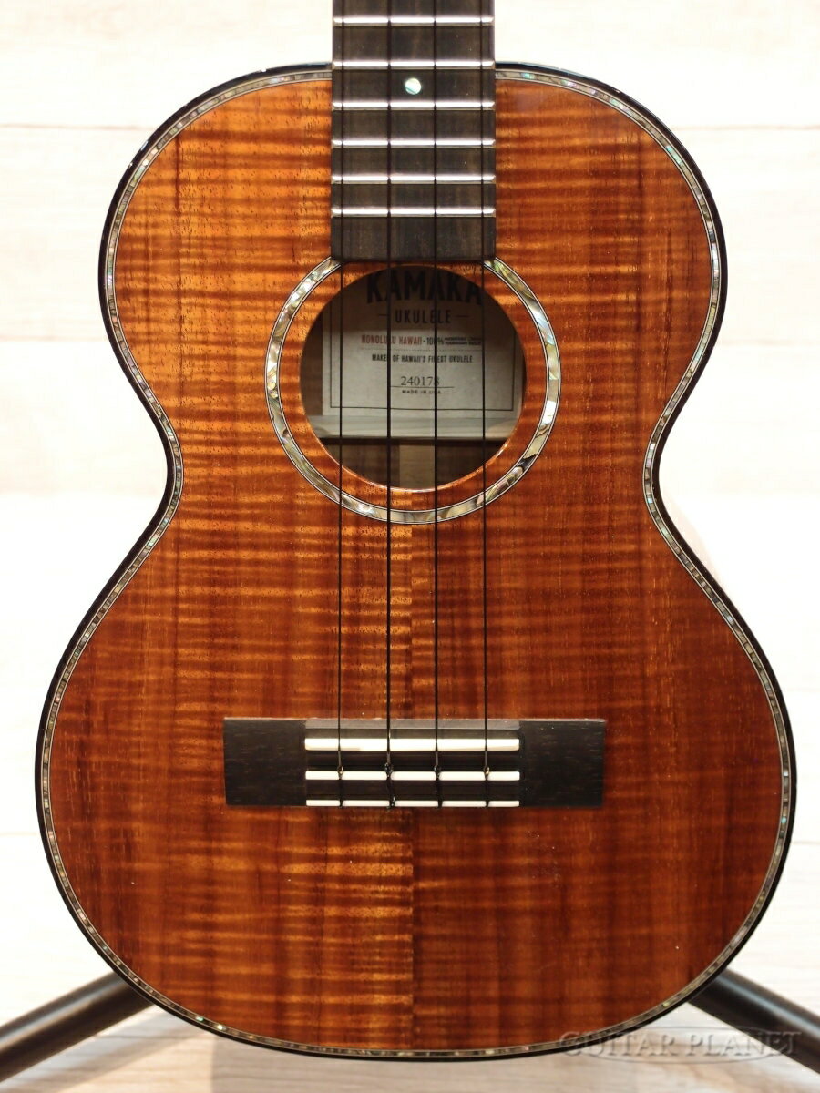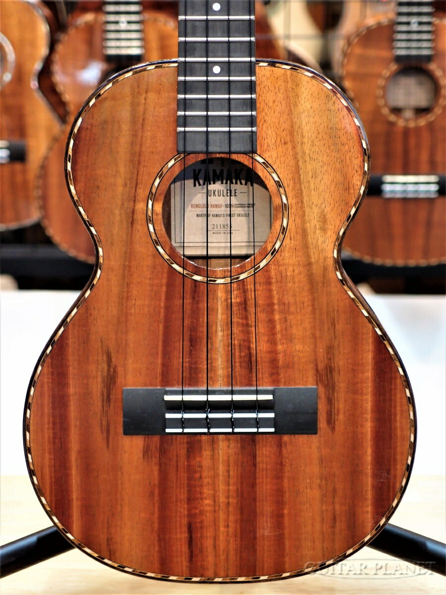 【カマカウクレレ正規輸入品取扱店】テナー・デラックスモデル! 【KAMAKA HF-3D 仕様】 サイズ:テナー トップ:ハワイアンコア単板(デラックスグレード) サイド&バック:ハワイアンコア単板(デラックスグレード) ネック:マホガニー 指板&ブリッジ:エボニー ヘッド突板:ハワイアンコア(デラックスグレード) ナット&サドル:タスク ペグ:SCHALLER(サイドキー・ギヤタイプ)※カスタム・ウッドボタン フレット:14Fジョイント/18F ポジションマーク/インレイ:MOP(マザーオブパール)/ドット(3,5,7,10,12,15) ヘッドロゴ:黒蝶貝 トップ・バインディング/パーフリング:ローズウッド/ロープパターン(ローズウッド/メイプル/コア) サウンドホール・ロゼッタ:ロープパターン(ローズウッド/メイプル/コア) ボディ・エンドストリップ:エボニー フィニッシュ(塗装):ラッカー・グロス仕上(艶有り) 弦:KAMAKA S-3(ブラック/ナイロン) ナット幅:36.5mm スケール(弦長):432mm 全長:687mm 胴長:309mm 胴幅(B):233mm 胴幅(T):179mm 胴厚:79mm 重量:0.63kg ※オリジナル・ハードケース付 ※演奏動画につきましては本個体とは異なります。ご了承くださいませ。 -------------------------------------------------------------- カマカウクレレはハワイアン音楽の歴史とも言われるほど、その土地の文化と長年にわたって深く関わってきました。 創業は1916年。1世紀にも及ぶ歴史を誇る『KAMAKA UKULELE』ファクトリーは、オアフ島のホノルル市街にあります。 創始者のサミュエル・カマカの言葉に“もし楽器を作って、ファミリーの名前を付けるなら、ガラクタは作るな”という言葉の意味するように、その理念、想いは代々確実に受け継がれ、変わることなく現在に至っています。 創業当初から、最高品質の楽器を作るという彼らの強い意志で生み出されてきたウクレレの素晴らしさは、世界中のプレイヤーからの信頼が物語っています。 HF-3スタンダードモデルとの大きな違いは、厳選された杢目の美しいハワイアンコア材をボディ、ヘッドプレートに使用しています。また、フィンガーボードとブリッジにはエボニー材を使用。豪華なデザインと音色にも拘った特別な仕様となっています。 デラックスならではのオプションデザインでもある、ロープバインディングは3種類の木材の組み合わせ。 見た目の自然な美しさもさることながら、注目するべきはその音色にあります。 1音1音の重み、深み、伸び、艶、輪郭、すべてにおいて特別な楽器ということに気付かされます。 弾き込むことによってエイジング効果が現れ、鳴りも変化していきます。底知れぬポテンシャルを感じることができると思います。 デラックスモデルは、より精度の高いファインチューニングがなされており、上品なデザインにふさわしい音色の華やかさが特徴です。 あらゆるウクレレの基準になっているとも言えるカマカウクレレですが、それだけにクセも無くどんな演奏にも向いています。むしろ弾き手ごとのポテンシャルを余すところなく引き出してくれる信頼できる相棒です♪ 100年以上にも及ぶ歴史を歩み、ハワイのウクレレ文化を育んできたカマカ。その集大成でもある技術と想いで生み出された1本のウクレレです。 是非このご縁をあなたに!! /_/_/_/♪出荷前調整ご要望承ります♪_/_/_/_/ ギタープラネットではご注文頂いた商品は 新品中古問わず検品・調整してから出荷致します。 弦高など細かなセッティング等、お好みに 合わせて調整も可能ですで、お気兼ねなく お申し付けくださいませ。 /_/_/_/_/_/_/_/_/_/_/_/_/_/_/_/_/_/_/_/_/_/ お問い合わせダイヤル:03-3259-0031 ※掲載画像は、カメラの特性やディスプレイなどの影響により、実際に肉眼で見える色合いと差がある場合がございます。 掲載商品売却に対応した在庫表示の反映は迅速を心がけておりますが、 タイムラグが発生する場合がございます。予めご了承ください。