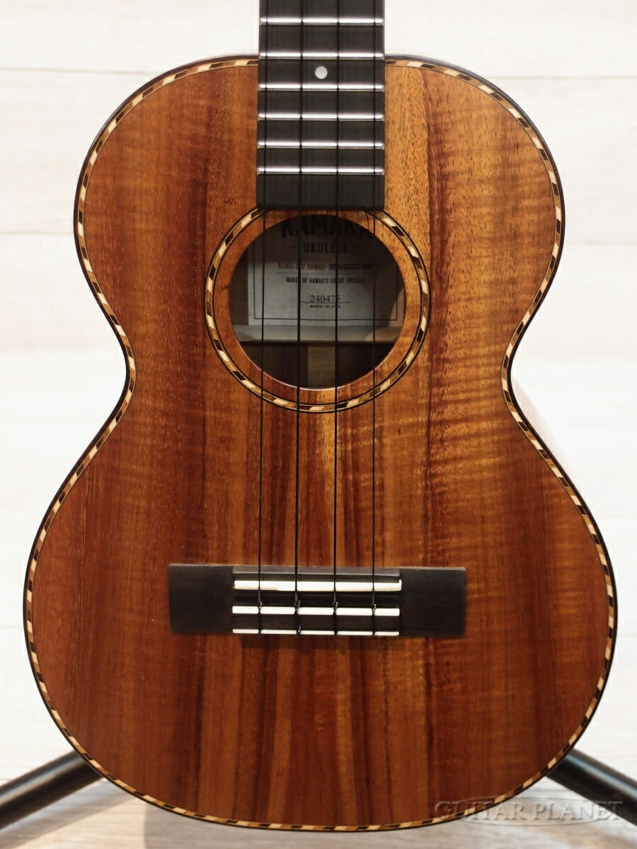 Kanile'aとは『楽しい音』の意味。 その名称に表れているように、伝統的なハワイアンウクレレの文化を大切にし、すべてのプレイヤーに愛されるような楽器製作を展開するという、理念をしっかりと持ったブランドです。 比較的新しいブランドですが、現在はハワイを代表するブランドの一つとなったカニレア。 ハワイ諸島は温暖な気候ですが、その中でも寒暖の差が比較的少なく、安定した気候のオアフ島にカニレア工房はあります。 最先端の技術を駆使しつつも熟練の職人達によって、1本1本丁寧に仕上げられています。 湿度管理の行き届いた工房内で、細部にわたって妥協のない製作工程のもと、100%ユーザーに満足してもらえることを望んで製作され、その高いクオリティーには定評があります。日本国内でもとても人気の高いハワイブランドです。 K-1シリーズはシンプルなデザインながらも、カニレアの魅力が惜しみなく反映された、定番人気のスタンダードモデルです。 また、本器はデラックスグレードの選定材を使用したハイグレード仕様。 音色にも定評があるカニレアですが、仕上げの丁寧さにも注目です。 UVグロス塗装により、杢目の美しいハワイアンコアの特徴を引き立てています。また、一般的なラッカー塗装よりも丈夫で汗などの水分に強い塗装ですので、より長く美しさを維持できます。 艶やかでレスポンスの良いサウンドが魅力的です。 ソプラノモデルは、スタンダードなハワイアンサウンドがお好みのプレイヤーにお薦めです。 また、カニレアのソプラノモデルは14フレットジョイント、21フレットまでの余裕の音域があり、ソロ演奏にまで対応できる仕様となっています。 2019年頃のモデルより、最新技術を取り入れた新しい仕様へと生まれ変わりました。 TRU-Rブレイシングの採用、GOTOH社製のカスタム・ギヤチューナー、ネック部の塗装にはシルキーフィニッシュ(サテン仕上)を採用し、高い演奏性と精度、何よりも音色に拘った設計へと進化しています。 【Kanile'a K-1S/DG 仕様】 サイズ:ソプラノ トップ:ハワイアンコア単板(デラックスグレード) サイド&バック:ハワイアンコア単板(デラックスグレード) ネック:マホガニー 指板&ブリッジ:エボニー ヘッド突板:エボニー ナット&サドル:GraphTech NuBone ペグ:GOTOH Custom Tuner(サイドキー・ギヤタイプ)※1:15ギヤ比/カスタム・ウッドボタン フレット:14Fジョイント/21F ポジションマーク/インレイ:MOP(マザーオブパール)/ドット(3,5,7,10,12,15) ヘッドロゴ:MOP(マザーオブパール) ブリッジピン:エボニー フィニッシュ(塗装):UVグロス仕上(艶有り) 弦:Aquila 100U(White/Super Nylgut) ナット幅:38mm スケール(弦長):342mm 全長:552mm 胴長:240mm 胴幅(B):173mm 胴幅(T):128mm 胴厚:63mm 重量:0.48kg 付属品:純正ギグバッグ、正規保証書 お問い合わせフリーダイヤル:0120-37-9630