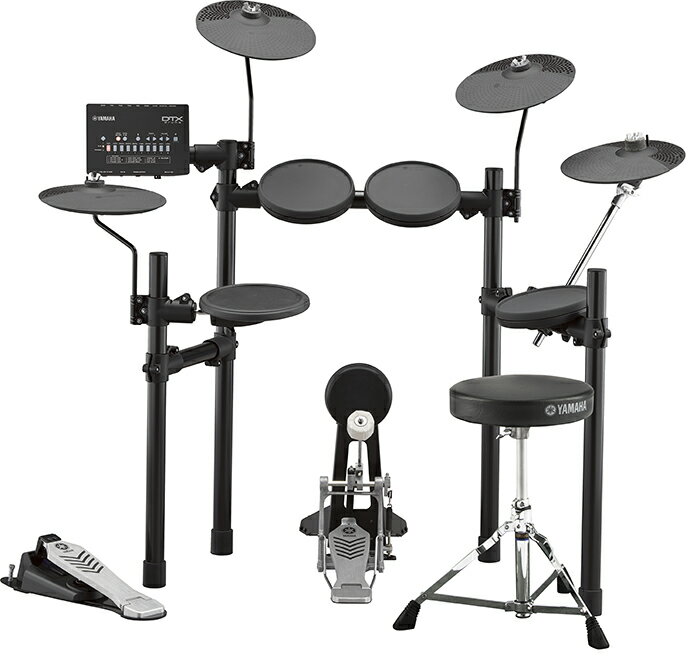 YAMAHA DTX432KUPGS 3シンバル仕様でよりリアルなセットアップに!ダブルフットペダルにも対応可能なキックパッド「KP65」採用!ハーフオープンも表現可能な、ハイハットコントローラー、HH65!プロドラマーにも定評のあるヤマハフットペダルの入門機種、FP6110A!ドラムスツール、DS550U付属! ヤマハDTXシリーズは、1996年に「サイレントセッションドラム」として静かな打音とドラム練習に適した機能を有し、自宅でドラムを楽しめる事を特長に発売。その後幾度かのモデルチェンジの中でドラム練習機能を追加し「ドラムが上達する電子ドラム」として好評を博す。 今回発売する「DTX402シリーズ」は、ステレオサンプリングによる高音質なドラムサウンドと新開発のパッド、ラックの採用により、クラスを超えた演奏性を実現。また、新たなドラム練習機能の追加と専用のスマホ/タブレット用アプリケーションなど、「楽しみながらドラムが上達する電子ドラム」として更なる充実を図っています! 主な特長 1. リアルで上質なドラムサウンド DTX402 シリーズの音源はヤマハのアコースティックドラムをステレオサンプリングしており、楽器本来の「鳴り」や「音の奥行き」まで忠実に再現します。アコースティックサウンドだけでなく、エフェクトサウンドやエレクトロニックサウンドなど、叩きたい曲にマッチする10 種のドラムキットを搭載しております。 多彩な415 音色を搭載 ドラムキット紹介(抜粋)1:POP1 / ポップスの演奏に適したオールマイティーなキット3:ROCK1 / ロックの演奏に適した迫力のあるキット6:FUNK / ハイピッチなスネアが特徴的なキット7:HIPHOP / 近代的なヒップホップでよく使われる音色のキット9:JAZZ / ジャズの演奏に適した小口径のキット 2. ドラムの本質を大切にしたキットデザイン ドラムを知り尽くしたヤマハだからこそ、ドラムの本質を大切にしながらもコンパクトなデザインが実現できました。シンバル、スネア、タムは好みの位置と角度に調整ができ、正しいフォームで演奏を楽しめます。 新採用のラックにより、キットの安定性が増したほか、高低のセッティング幅も広がりました。低めのセッティングも可能なので、お子様にもお楽しみ頂けます。ラックは仮組みされた状態で梱包されており、組立も簡単です。また、叩き心地を追求して新開発されたタムパッドは、静粛性と演奏性を両立しました。 ・コンパクトに収納可能・アコースティックドラムに近いセッティングが可能 3. 楽しみながらドラムスキルを習得できるトレーニング機能 電子ドラムだからこそ実現できる練習機能を10 種類搭載。ドラムの基礎となる正確なリズム感を鍛える「リズムゲート」、初心者でもドラムが叩けるようになる「ソングパートゲート」などがあります。内蔵練習曲は、楽譜とお手本演奏動画をご用意しており*1、初めての方でも安心です。客観的に技術力を判断できる採点機能も搭載しており、楽しみながらドラマーとしての表現力を高めるサポート機能が充実しています。 トレーニング機能紹介(抜粋) 1:リズムゲート1 / 内蔵練習曲やクリック音に合わせて、正確なタイミングでパッドを叩くトレーニング(16分音符のリズム)3:ダイナミックゲート / パッドを叩く強さをコントロールするトレーニング4:ソングパートゲート / 内蔵練習曲を部分的に練習する実践的なトレーニング6:メジャーブレイク / クリック音に頼らずにテンポを維持するトレーニング10:レコーダー / 自分の演奏を手軽に録音できる機能 4. 無料アプリとの連携による、直感的な操作と高い拡張性 *3 iOS/Android 対応アプリDTX402 Touch を使えば、スマートデバイスの画面でトレーニング機能やサウンドエディット機能をより直感的に操作可能となります。内蔵練習曲の譜面を表示したり、トレーニングの採点結果をパッドごとに確認したり、アプリならではの様々な拡張機能をお楽しみ頂けます。「チャレンジングモード」機能を活用すれば、内蔵練習曲を使ってゲーム感覚でドラム演奏を習得することが出来ます。最後まで到達した方にはヤマハからドラマー認定証*2 を贈呈いたします。また、iOS アプリ「Rec’n’Share」をご用意。ライブラリーからお気に入りの楽曲を選択すれば、アプリが自動でテンポを検出し、クリックを付加します。テンポ変更、リピート再生機能も搭載し、ドラムの練習を強力にサポートします。iOS 端末でアプリを使用して動画を撮影すれば、DTX402 の演奏動画が手軽に作成可能です。楽器と楽曲の音量バランス調整などの簡易編集、アップロードまでをアプリの中で行うことが出来ます。 *1 楽譜とお手本動画については、ヤマハWeb サイトのDTX402 製品ページおよび、DTX402Touchアプリ内で確認頂けます。*2 「DTX402Touch」アプリ内で、SNS などで共有可能な認定証を贈呈いたします。*3 ・上記アプリケーションはご利用の端末と、DTX402 本体をUSB ケーブルで接続して使用します。iOS端末とUSB ケーブルの接続には、Apple 社のLightning-USB カメラアダプタ