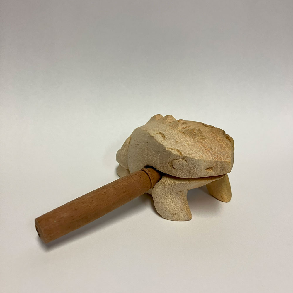 【DA-F06】 カエル型ギロ。背中をバチでなでるとケロケロと音が響きます。 木製、バチ付 全長6cm