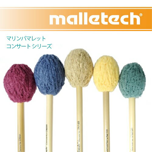 Mallerech Mallet : マレテック マレット[ハンドル:ラタン]■CN4R ソフト soft (レッド)ソフトながら、全音域でむらなく響くリッチなトーンです。■CN9R ソフト-ミディアム soft-med (ブルー)深みのある響きからクリアでリッチな響きを持つモデルです。■CN14R ミディアム-ミディアムハード med-med hard (マスタードイエロー)最も平均的な使い勝手の良いモデルです。■CN21R ハード-レディハード hard-very hard (イエロー)クリアな輪郭のハードマレット、幅広いダイナミックスを持つ。■CN26R エクストラハード Ex hard (エメラルドグリーン)大編成バンドでも埋もれない、しっかりしたクリアな響きです。○コンサート シリーズ反応が良く、幅広いレスポンスを持ち、パワフルな演奏も可能なシリーズで凡庸性の高い、スタンダードなシリーズとして人気が高いモデル。また太めの毛糸をしっかり巻くことで、ハードなプレーでありがちなアタックの打撃音が軽減され、雑味の少ないクリアなハードサウンドが得られます。