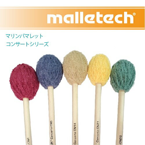 Mallerech Mallet : マレテック マレット[ハンドル:バーチ]■CN4 ソフト soft (レッド)ソフトながら、全音域でむらなく響くリッチなトーンです。■CN9 ソフト-ミディアム soft-med (ブルー)深みのある響きからクリアでリッチな響きを持つモデルです。■CN14 ミディアム-ミディアムハード med-med hard (マスタードイエロー)最も平均的な使い勝手の良いモデルです。■CN21 ハード-レディハード hard-very hard (イエロー)クリアな輪郭のハードマレット、幅広いダイナミックスを持つ。■CN26 エクストラハード Ex hard (エメラルドグリーン)大編成バンドでも埋もれない、しっかりしたクリアな響きです。○コンサート シリーズ反応が良く、幅広いレスポンスを持ち、パワフルな演奏も可能なシリーズで凡庸性の高い、スタンダードなシリーズとして人気が高いモデル。また太めの毛糸をしっかり巻くことで、ハードなプレーでありがちなアタックの打撃音が軽減され、雑味の少ないクリアなハードサウンドが得られます。