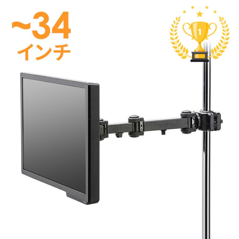 細めの支柱へ取り付け可能なモニターアーム。15kgまで対応した高耐荷重仕様で液晶テレビの取り付けにも対応。広いスペースに便利な長タイプ。※箱にキズ、汚れがありますが商品は新品です。<特長>●直径25〜40mmの丸パイプや25×25〜30×30mmの角パイプに取り付け可能なモニターアームです。●VESA規格に準拠し、75×75mmおよび100×100mmの取り付け穴を有する液晶ディスプレイがマウントできます。●水平多関節タイプで、モニターの向きを任意の方向へ向けることができます。●アーム下にはケーブルクリップ付きです。●ディスプレイ取り付け部は360°回転するので、水平方向に取り付けられたパイプにも取り付け可能です。●耐荷重は15kgです。※想定されるディスプレイサイズは一般的な目安を示しています。取り付けにおいてはディスプレイ重量と耐荷重を基準として選定して下さい。<仕様>■カラー:ブラック■サイズ:W120×D490〜510×H115mm■重量:2.2kg■出荷形態:組立出荷 ■梱包:1個口/525×149×143mm・2.5kg ■材質:スチール(エポキシ樹脂粉体塗装) ■付属品:ディスプレイ取り付け用ネジ(M4×10)■総耐荷重:15kg ■必要工具:プラスドライバー、 手袋 ■メーカー保証:なし■対応モニターサイズ:15・15.6・16・17・18.5・19・19.5・20・20.7・21・21.5・22・23・23.8・24・25・26・27・28・29・30・31・32・33・34インチなど※モニターの耐荷重 15kg■対応モニター参考メーカーIO DATA(IOデータ)・アトランティス(ATLANTIS)・iiyama(イイヤマ)・AOC・Acer(エイサー)・ASUS(エイスース・アスース)・EIZO(ナナオ)・MSI(エムエスアイ)・HP(ヒューレッド・パッカード)・LGエレクトロニクス(LG Electronics)・シャープ(SHARP)・DELL(デル)・フィリップス(PHILIPS)・ドウシシャ(DOSHISHA)・ViewSonic(ビューテック)・BenQ(ベンキュー)など■対応ポールサイズ:直径25〜40mmの丸パイプや25×25〜30×30mmの角パイプ■VESA:75×75、100×100(mm)■対応モニター:34インチ、15kgまで<関連キーワード>病院 支柱 ゲーミング モニタースタンド 液晶ディスプレイ テレビ ディスプレイ受付 会社 オフィス デスク 机 クランプ 机取り付け テレワーク リモートワーク 在宅 サンワサプライ 4969887192702