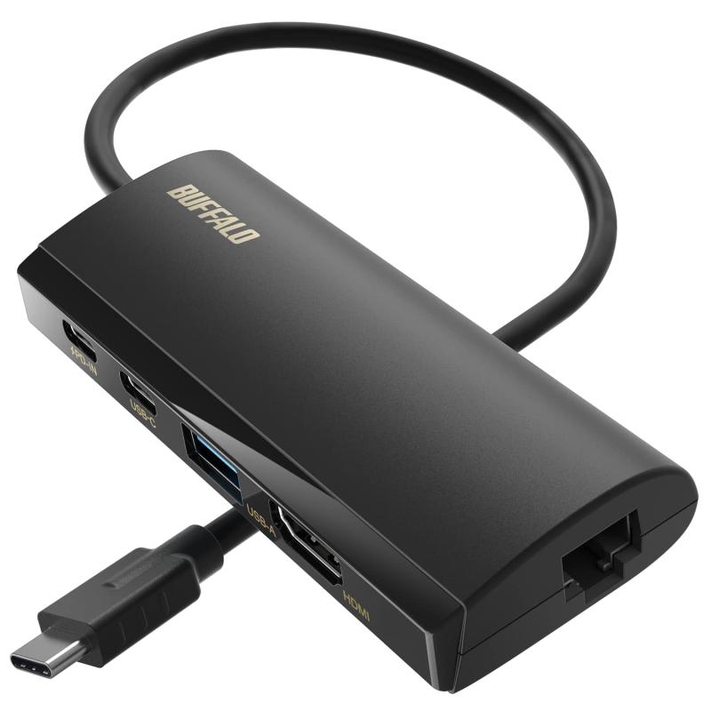 バッファロー ドッキングステーション 5-in-1 USB Type-C PD HDMI LANポート USB 3.2 (Gen 1) 85W Power delivery iPhone 16 対応 ブラック LUD-U3-CGHDBK/N【対応機種】USB 3.2(Gen 1)/USB 3.1(Gen 1)/3.0 端子(Type-C)搭載のWindowsパソコン、MacおよびChromebook【ケーブル長】約30cm※コネクター部除く【電力供給方式】バスパワー/USB PD3.0給電【最大転送速度】最大5Gbps(規格値)【外形寸法(幅×高さ×奥行)】約102mm×約16mm×約41mm※ケーブル・突起部除く【質量】約62g【規格】VCCI classB【主な付属品】取扱説明書/保証書【USBポート】パソコン側:Type-C オス×1(ケーブル直付け):通信用/充電用(USB PD対応/最大85W)、USB3.2(Gen1)/USB3.1(Gen1)/3.0/2.0/1.1、周辺機器側:USB Type-Cメス×1:通信用、USB 3.2(Gen1)/3.1(Gen1) /3.0/2.0/1.1 、最大電流900mA、USB Type-Aメス×1:通信用、USB 3.2(Gen1)/3.1(Gen1) /3.0/2.0/1.1、最大電流900mA【PD入力ポート】Type-C メス×1:給電用、最大入力100W【LANポート】規格:IEEE802.3ab準拠(1000BASE-T)、IEEE802.3u準拠(100BASE-TX)、IEEE802.3(10BASE-T)【HDMIポート】規格:HDMI High Speed、HDCP 2.24K出力に対応したHDMIの映像出力が可能。映像出力ポート非搭載のパソコンを使用している場合や、訪問先のプロジェクターやモニターを使用する際も対応可能です。*接続先のパソコンが、USB Type-Cからの映像出力(Displayport Alternate Mode)に対応している必要があります。