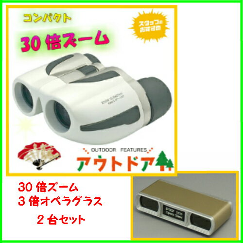 3倍オペラグラスと30倍ズーム双眼鏡のセット品です 30倍ズーム仕様 その場から1歩も動かず、いつでも自分好みの大きさで見れる30倍ズーム双眼鏡 倍率変更はレバーを指1本で操作するだけ レンズにマルチコート採用。明るく綺麗な視界で見えますアリーナ、スタジアムコンサート、野球、サッカー、スポーツ観戦、バードウォッチング等にこれ1台で全てOK。 倍率:10〜30倍 対物レンズ径:21mm 実視界:3.15-1.42° 射出瞳径:2.1-0.7mm 明るさ:4.4-0.5 1000m先の視野 55-25m 重量:約200g サイズ(H×W×D):96×50×110mm 付属品:ケース、ストラップ、レンズクロス 備考:マルチコート 3倍オペラグラス仕様 鞄にすっぽり入るスリムタイプの3倍オペラグラス 倍率:3倍 対物レンズ有効径:25mm 重量:約60g サイズ(H×W×D):21×47×98mm 付属品:ストラップ