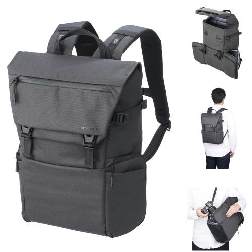 大きく開くフラップトップと両サイドアクセス構造の2気室タイプバックパック。街に溶け込む洗練されたデザインでビジネスや普段使いにも適しています。 カメラ機材と、それ以外の荷物を上下に分けて収納できる使い勝手の良い2気室構造。上段は大きく開いて出し入れしやすいフラップトップの収納スペース。下段は左右両側が開くサイドアクセス式のカメラ機材収納部です。 使い勝手の良いスリムデザインのサイドポケットを左右に装備。使用しない時はフラットな状態で邪魔にならず、必要な時にはマチが拡張してボトルなどが収納できるスペースに広がります。 前面フラップのアクセサリーポケットにはYKK社製の止水ファスナーを採用。内部に鍵やエアタグなどを取り付けられるフックコードがついています。 ●カメラ収納部内寸法:約W260×H220×D120mm、●上段収納部内寸法:約W260×H180×D120mm、●PC収納部参考収容寸法:約W240×H350×D20mm、●外寸法:約W310×H430×D150mm、●容量:約12L、●重量:約950g