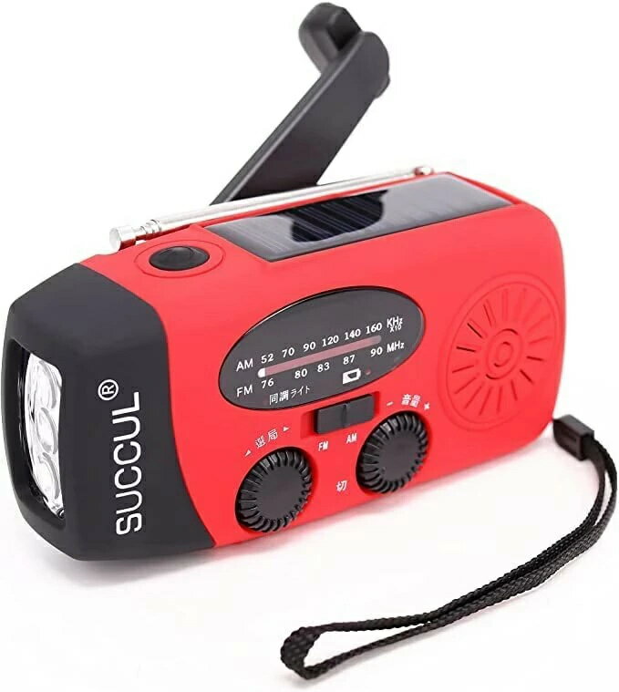 商品説明FM/AM/防災ラジオ 信号受信:AM 520-1710Khz / FM 76-90Mhz。 防水性:IPX-3 台風、津波、地震、停電など災害を防ぐための緊急対策ラジオです。このラジオライトは、停電、電気通信の不安定または中断された場合に、外界からの災害情報を収集可能。緊急時、救援者は迅速に位置を特定する可能。高輝度懐中電灯:高輝度3つのLEDライトを内蔵された充電式ライト、備えておくと安心なライトです。 外装全体は明るくの赤、光不足の場合も目に立ちます。モバイルバッテリー :2000mahバッテリーを内蔵され、モバイルバッテリーとしても使用可能。緊急時に携帯電話などUSBグッズに携帯充電器などとして充電可能。3つの充電方法 手回し充電手回しラジオ:製品の背面にあるハンドルを回すと充電可能。ソーラー充電ラジオライト:ソーラーパネルを日差しの方向に向けると、自動的に充電可能 USBケーブルで充電:付属しているUSBケーブルでUSBポートから充電可能.小型・超軽量: 12.8cm * 6cm * 4.5cm 重量200g!緊急時に持ち運びやすく、収納しやすい。 完全防水ではないので、水に浸すことはいけません。