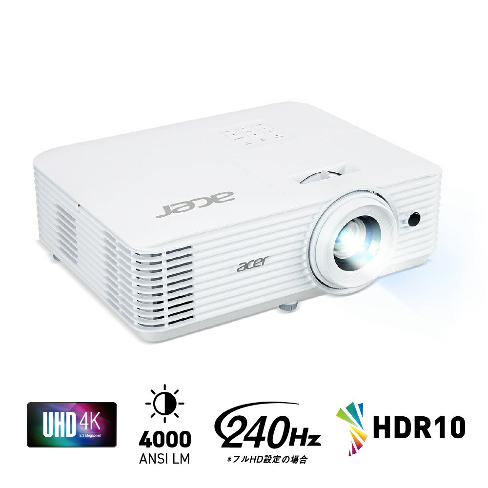 ■高精細でより深みのある映像を4K UHD対応で圧倒的高精細の美しい映像を投写。また、フルHD設定時には240Hzリフレッシュレートに対応。300インチの大画面*でスポーツ観戦やゲームなどを存分に楽しめます。 *投影距離7.6m〜10mの場合。約3.5mで100インチとなります。■明るい室内でも鮮明な映像を明るさ 4000ANSIルーメンの高輝度設計が日中の室内でもクリアで鮮やかな映像を映し出します。また、HDR10対応で輝度の幅が拡大。より実物に近い映像を再現することでこれまでにない臨場感を味わえます。■ダイナミックな空間を演出10W スピーカーを 1基内蔵。外付けのスピーカーを使うことなく、ダイナミックなサウンドを心ゆくまで堪能できます。■インテリアに合わせて映像のひずみを補正できる台形補正機能と4点コーナー補正機能を搭載。設置場所を選ばず、お好みの場所で再生できます。■大画面で試合観戦をAcer 独自のFootball モードを搭載。輝度、彩度、シャープネス、ガンマを最適化しフィールドのグリーンやプレーヤーを鮮やかに投影。まるでその場にいるかのような臨場感を味わえます。■環境にも配慮Acer EcoProjection機能を搭載し、Ecoモードに移行時には消費電力を70%まで削減、ランプの交換時間を最長12,000時間まで延長します。ノイズレベルは26dBAで静音化を実現しています。