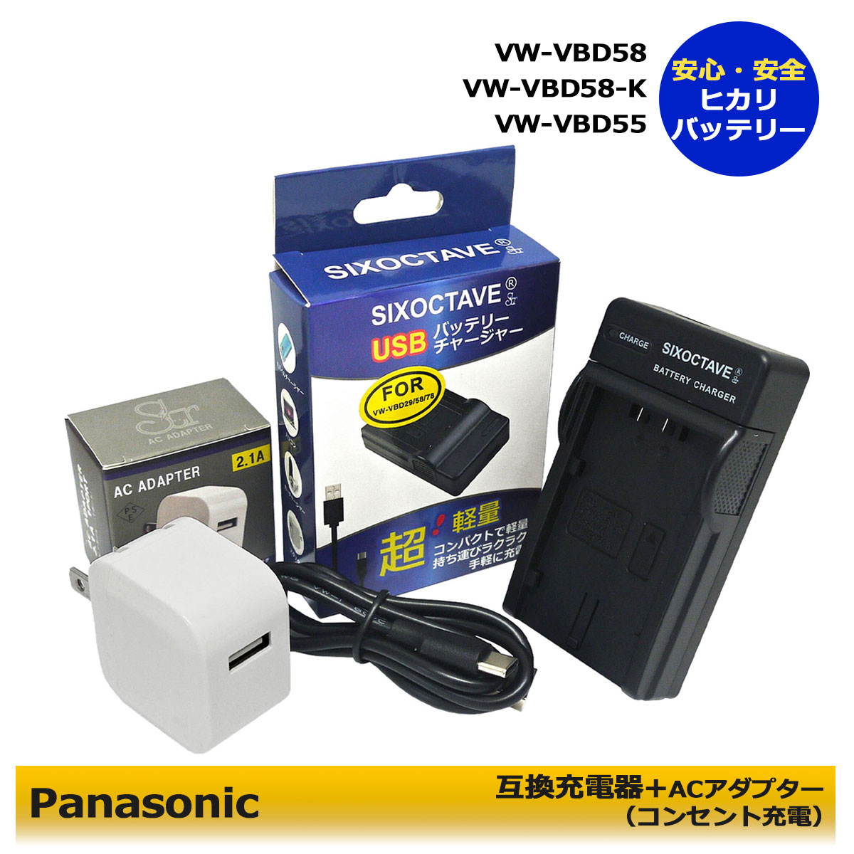 ★コンセント充電可能★ パナソニック VW-VBD58 / VW-VBD58-K / VW-VBD55 互換チャージャー 1個とACアダプター1個の2点セット AJ-PJ50 / AU-EVA1T8 / AJ-PX270 / AJ-PX270T8 / AG-AC30 / AG-CX350 / AG-UX90 / AG-UX180 / AG-UX90T8 / AG-UX180T8 (A2.1)